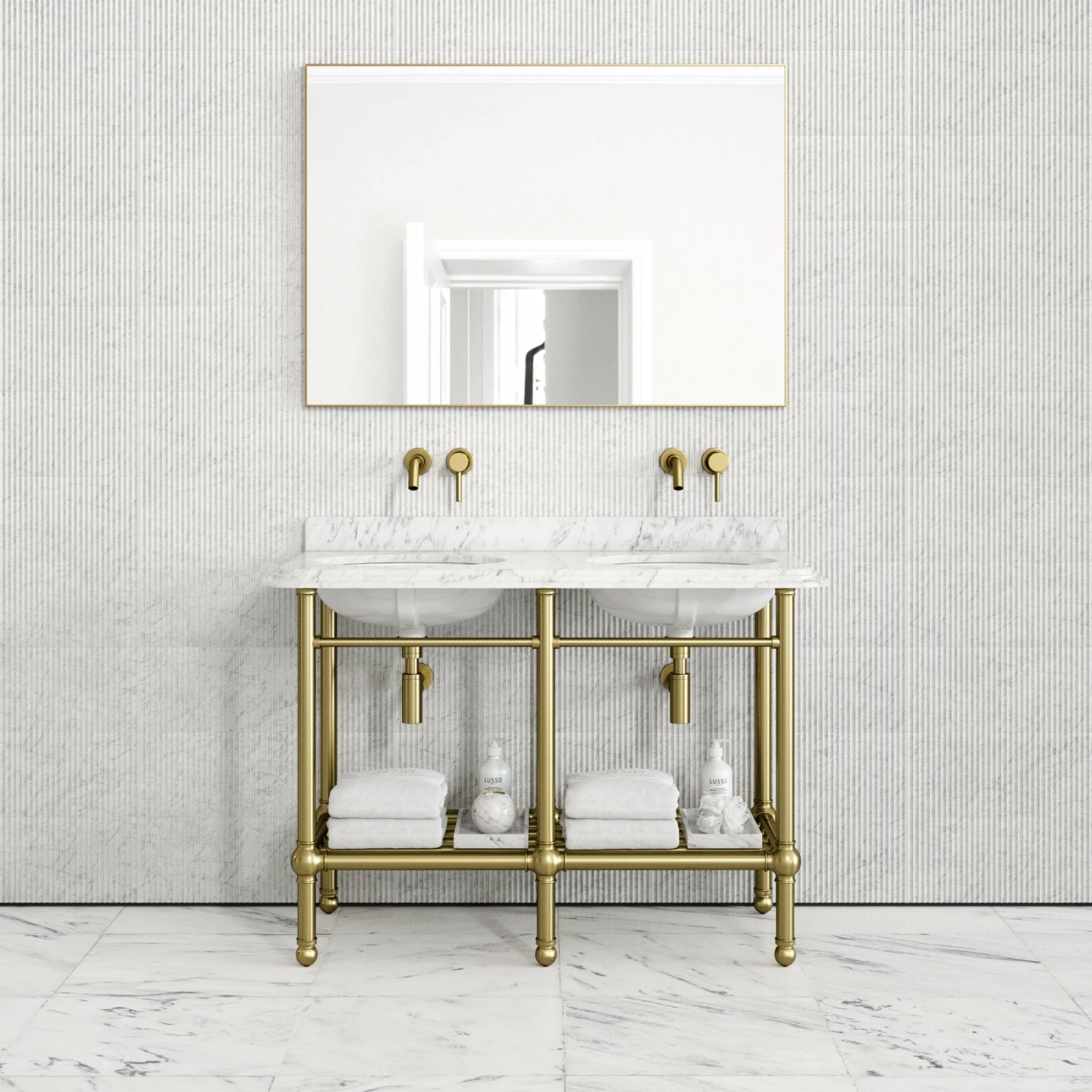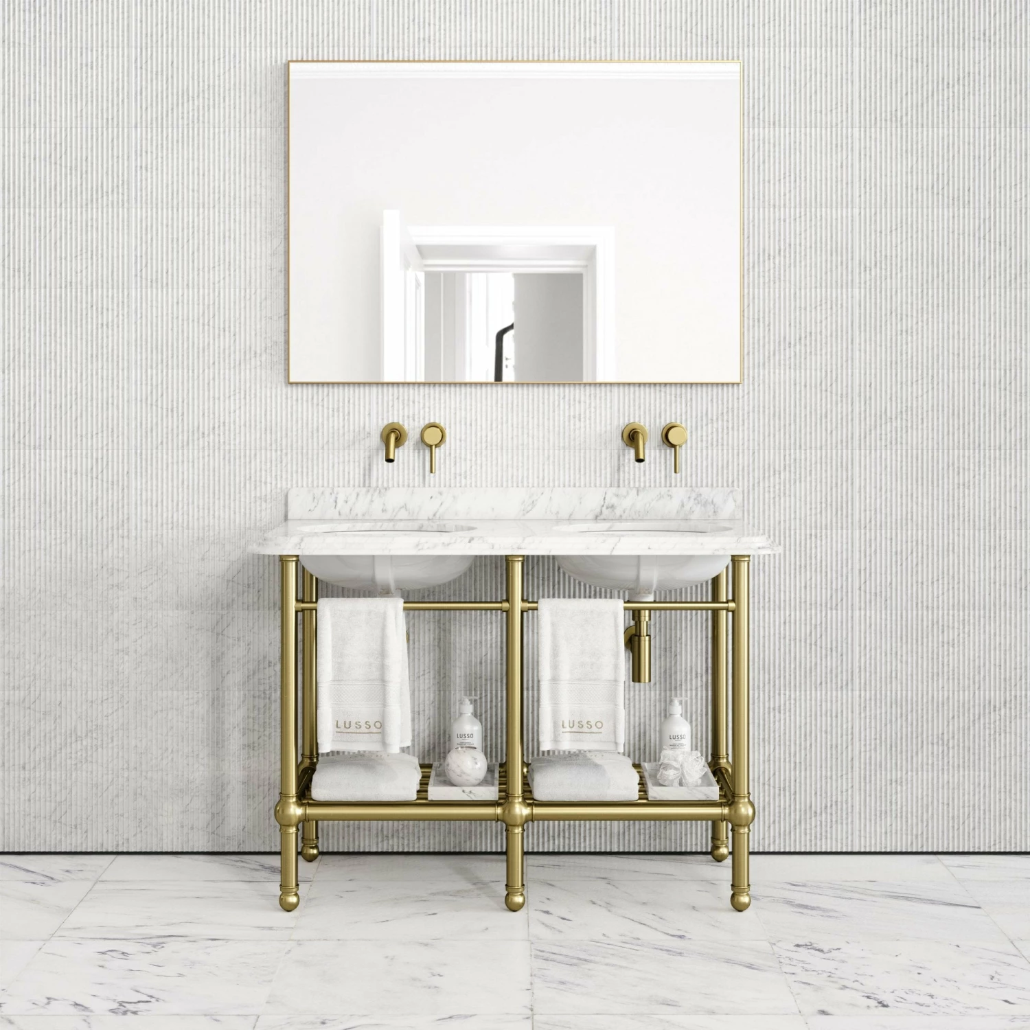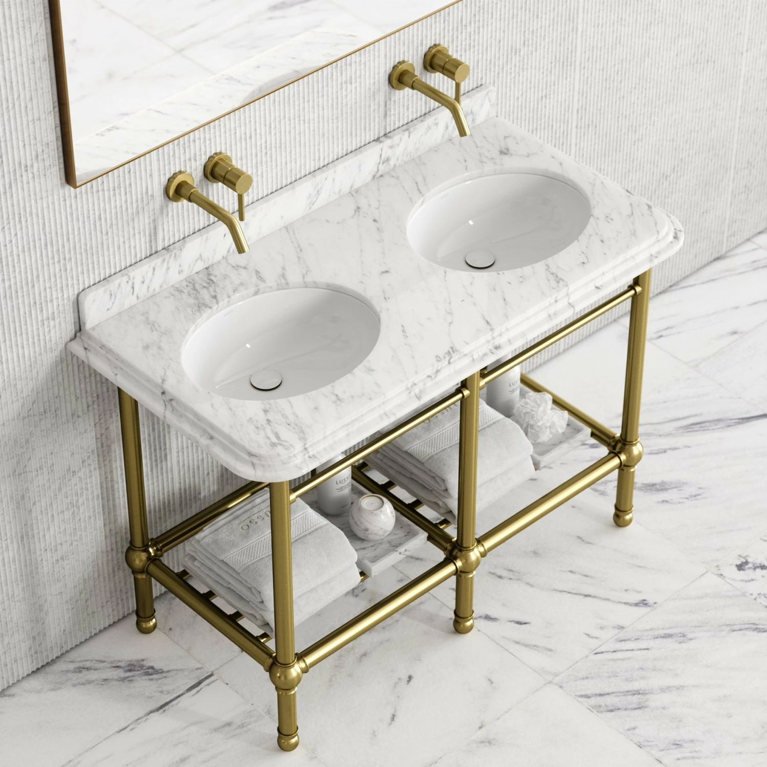 The freestanding vanity unit is finished with a luxuriously honed marble top, crafted from the Italian Carrara marble, which surrounds double built-in basins, ideal for couples or family bathrooms.