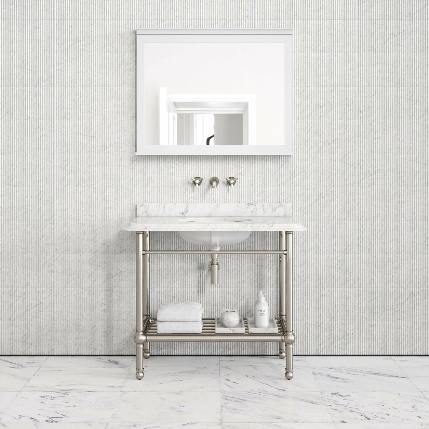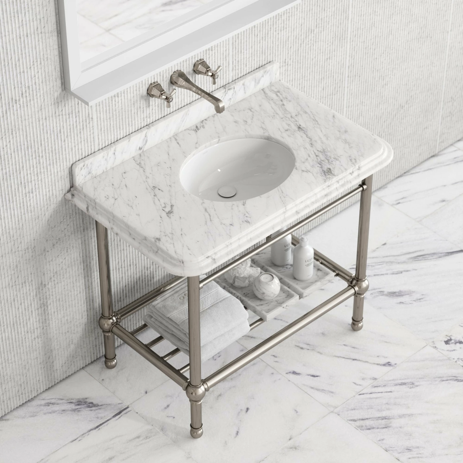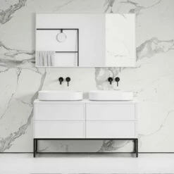 Beautifully elegant and exclusive to Lusso, the vanity unit takes inspiration from the iconic Art Deco movement, featuring geometric shaping, honed cove ogee edging and a radiant polished nickel frame, designed to work excellently with other polished nickel pieces from our Deco collection, including taps, accessories and showers.