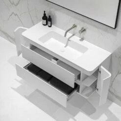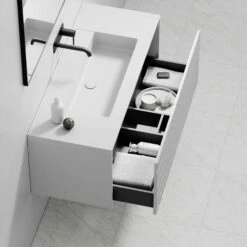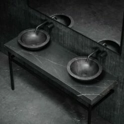 The vanity unit contains a built-in ceramic basin within the marble as well as a shelf underneath for neatly storing towels or a self-care basket, allowing the vanity to be practical and versatile as well as luxurious.