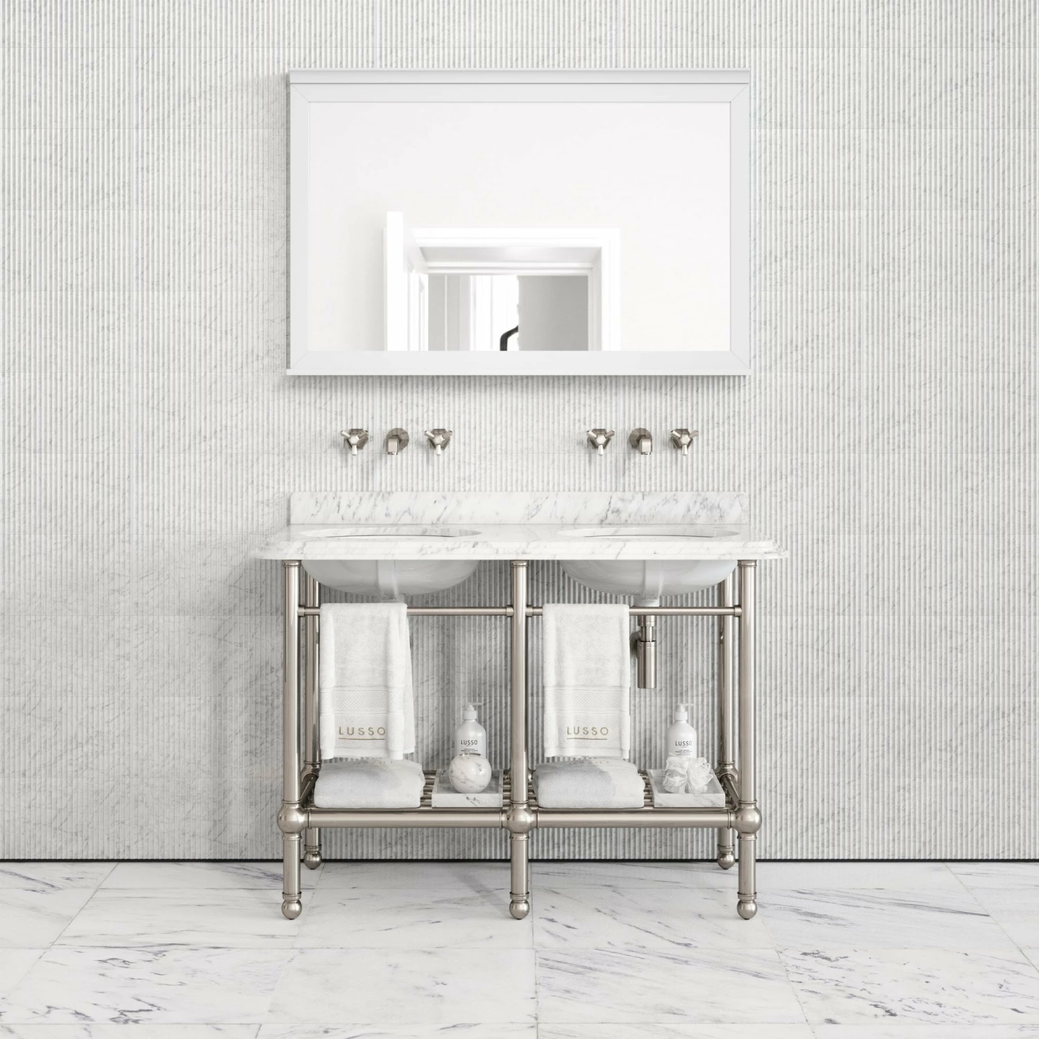 Defined by striking framework, a Carrara marble countertop and a practical double ceramic basin feature, the freestanding vanity unit can be installed within couples’ or family bathrooms and contains a functional undershelf for storing your Lusso towels.