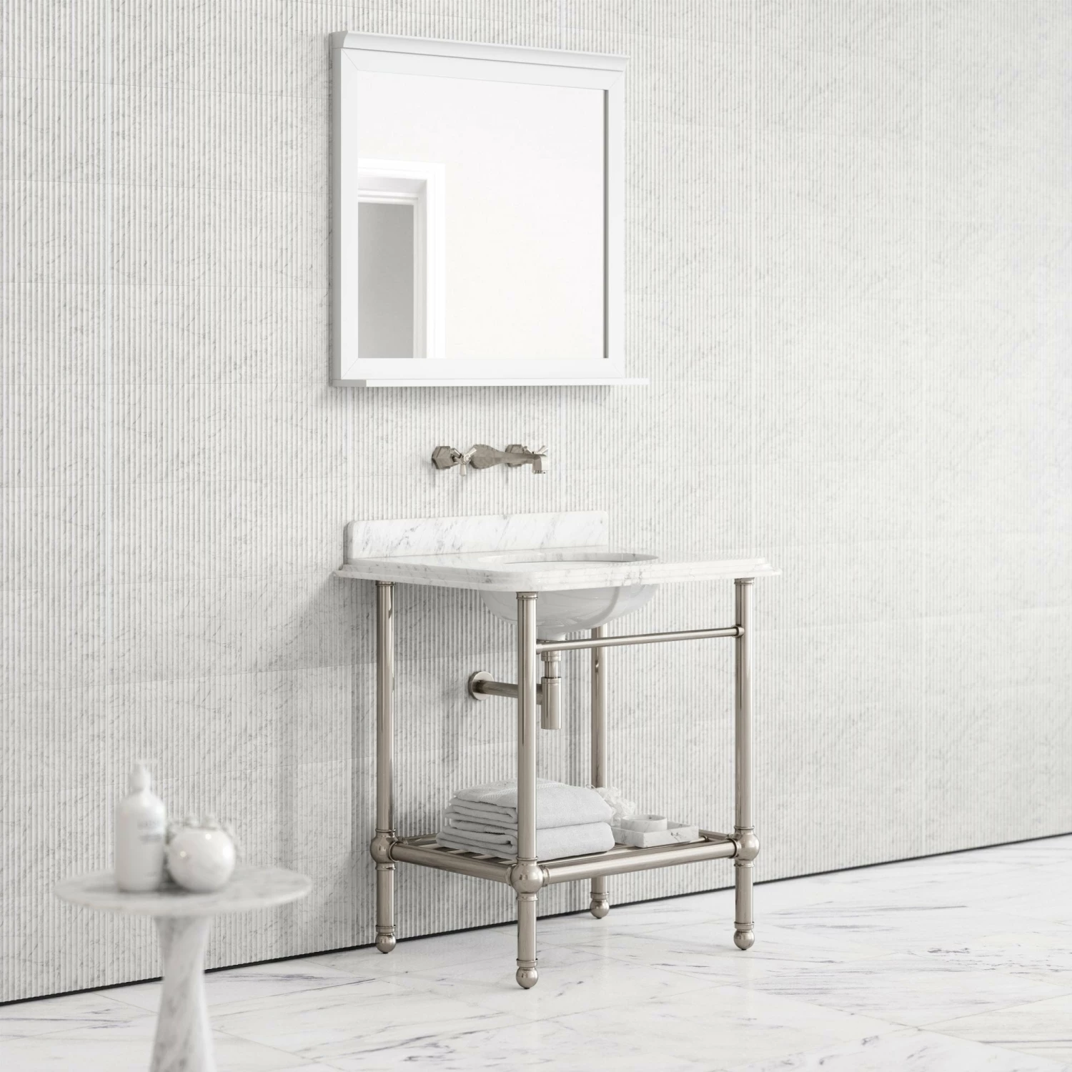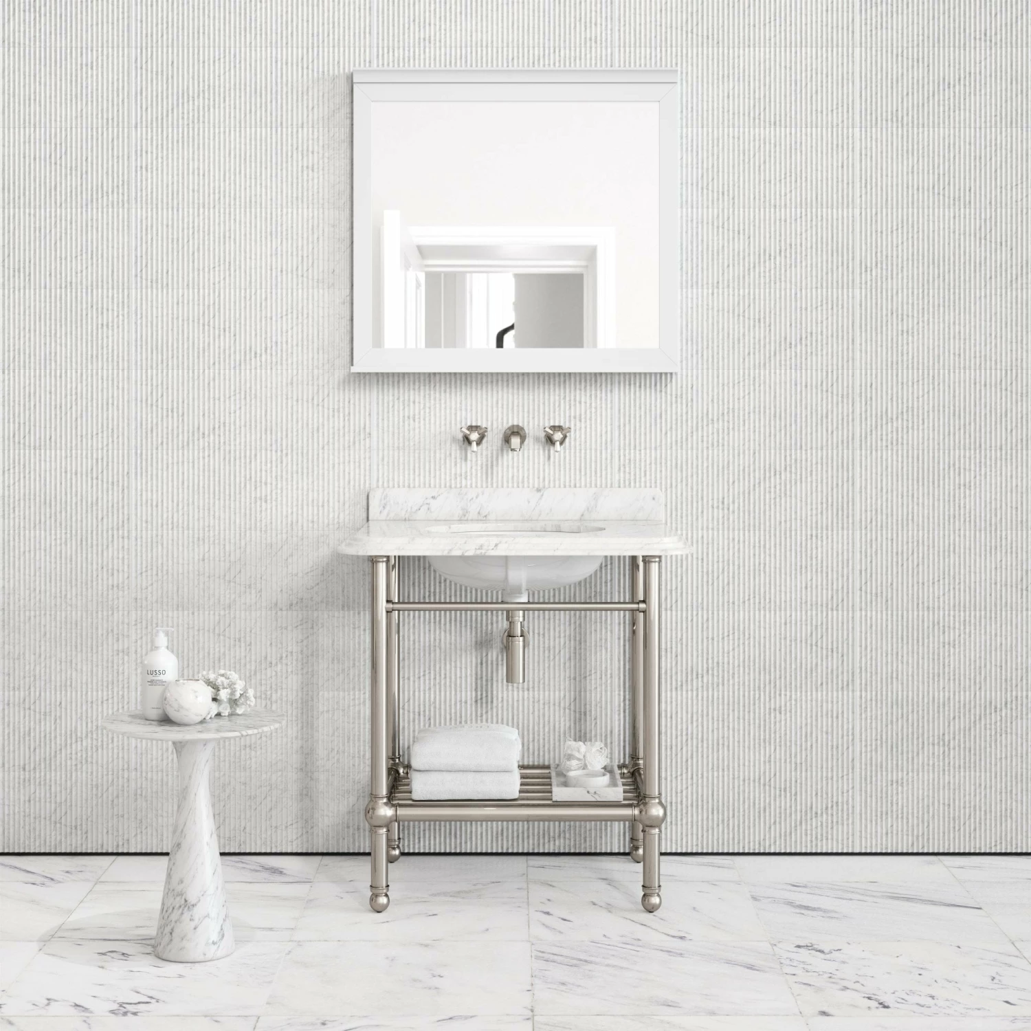 The vanity unit boasts geometric shaping and cove ogee bevelling to the luxurious Carrara marble top, finished with a built-in ceramic basin and under shelf for neat towel storage.