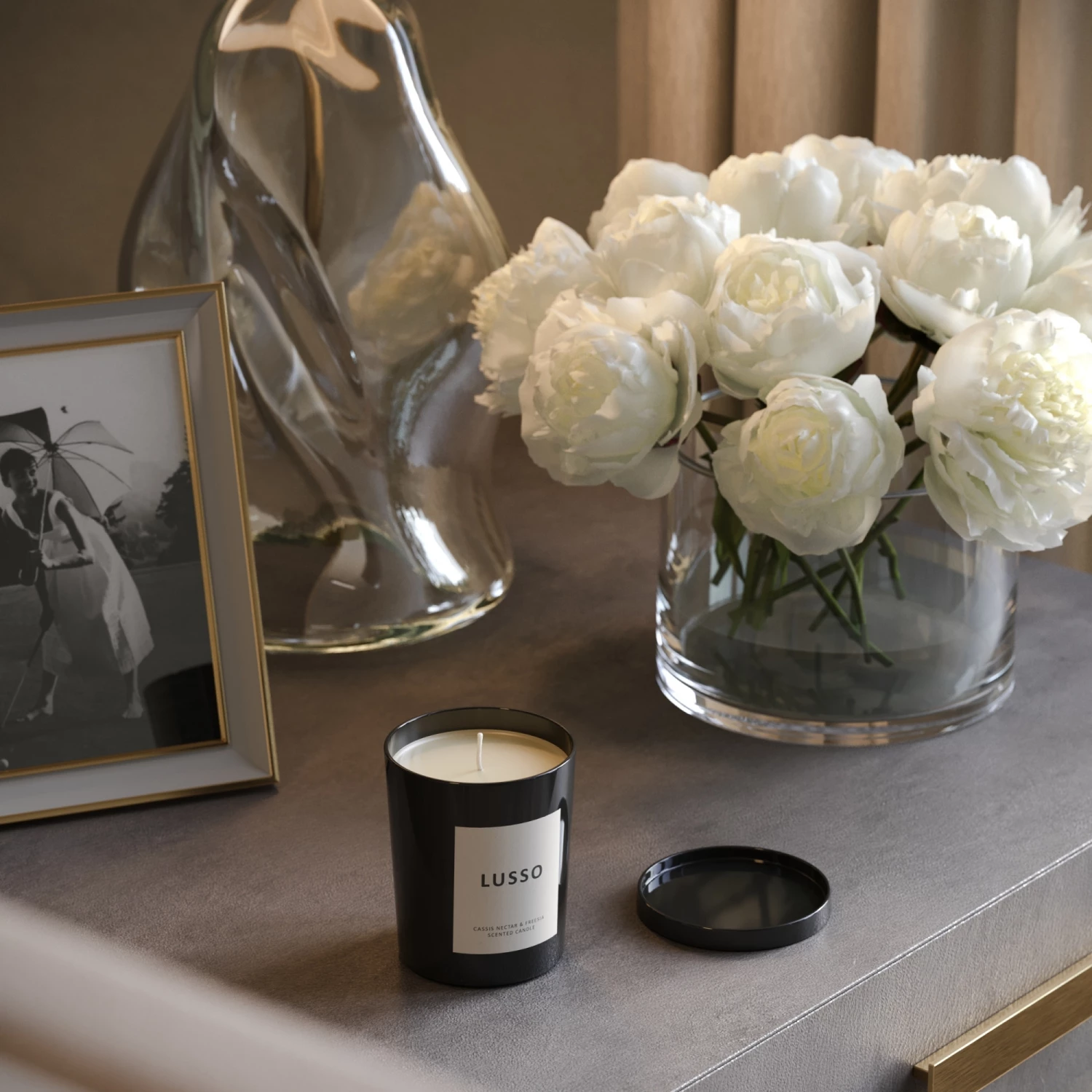 Create a serene experience and heightened ambience in your home with Lusso’s Cassis Nectar and Freesia Scented Candle.