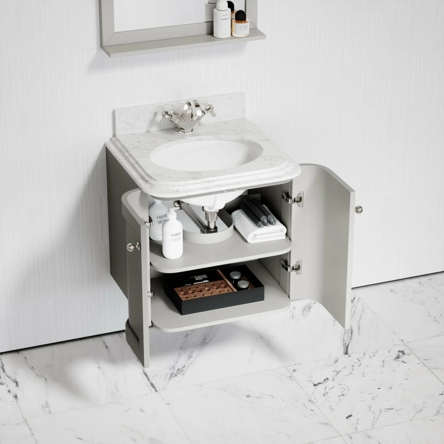 Featuring a countertop crafted from the finest Italian polished Carrara marble, our 600mm wide Charsley Matte Stone Vanity Unit is the perfect centre point for all luxury bathrooms, big or small. Featuring a polished oval basin to the countertop, the Charsley is also crafted from durable marine grade plywood in a matte stone finish, resulting in a cabinet that’s designed to last whilst retaining its beauty, and expertly finished with elegant cove ogee bevelled edging.