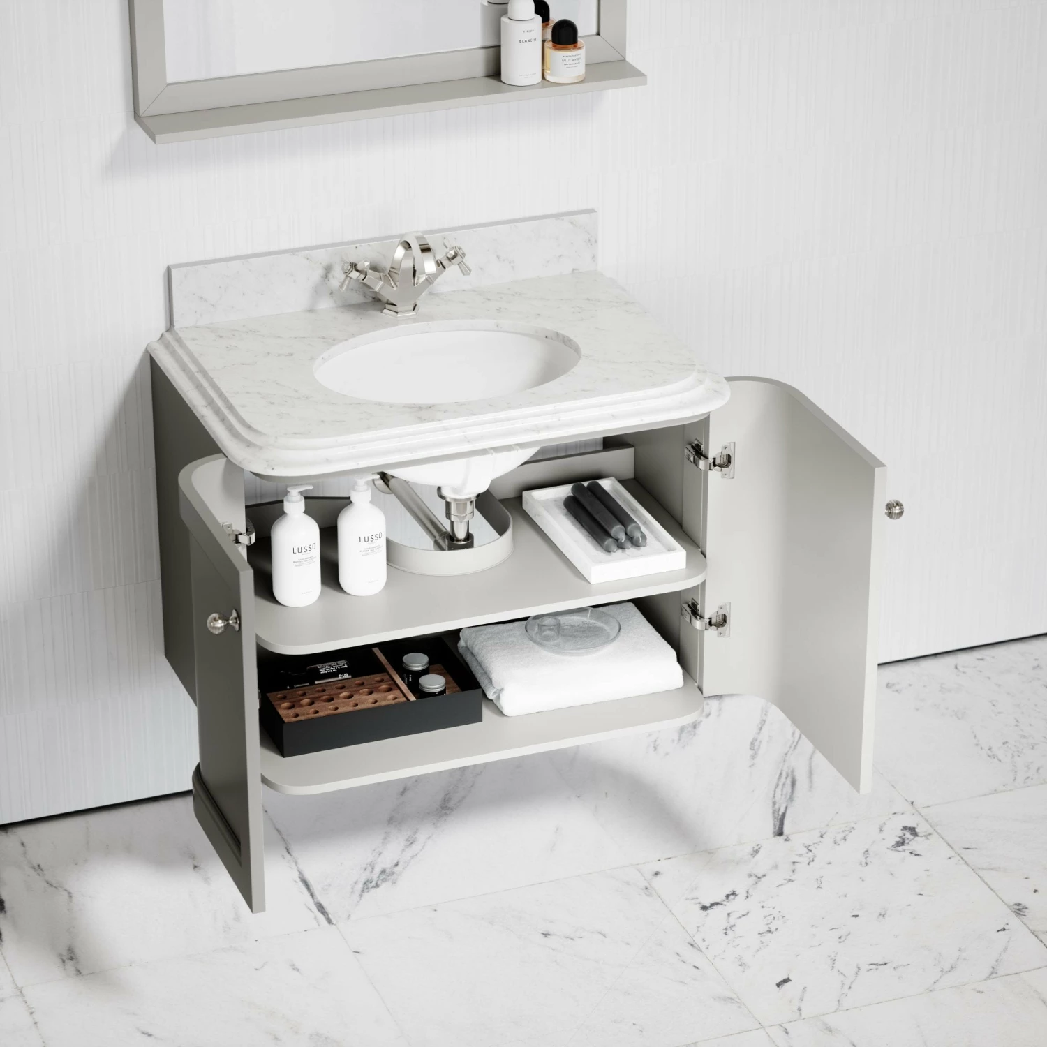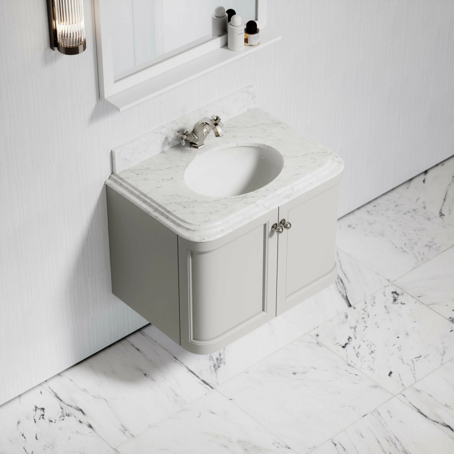 As well as an elegant curved structure, the Charsley Wall Hung Matte Stone Vanity Unit features a built-in polished ceramic basin, highlighted beautifully by a marble surround. The luxury Carrara has been carefully finished with a bevelled cove ogee edge and polished finish, in keeping with its Art Deco influence.