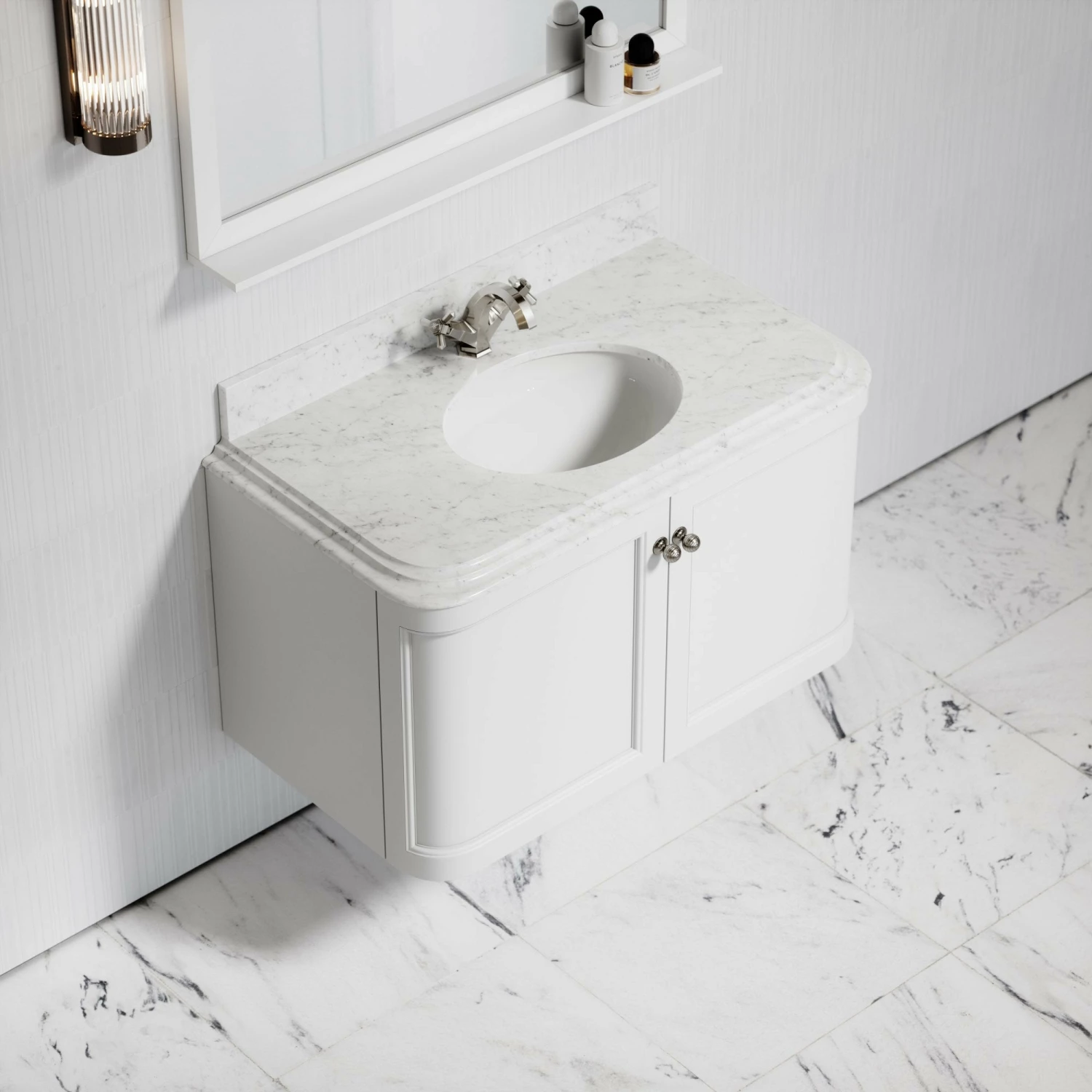 The Charsley Vanity Unit is defined by its glamorous, elegant appearance. Featuring a smooth countertop carved from Italian Carrara marble in a polished finish, alongside a built-in oval basin, the wooden vanity unit is a seamless contrast between modern and traditional design, finished with cove ogee bevelled edges.