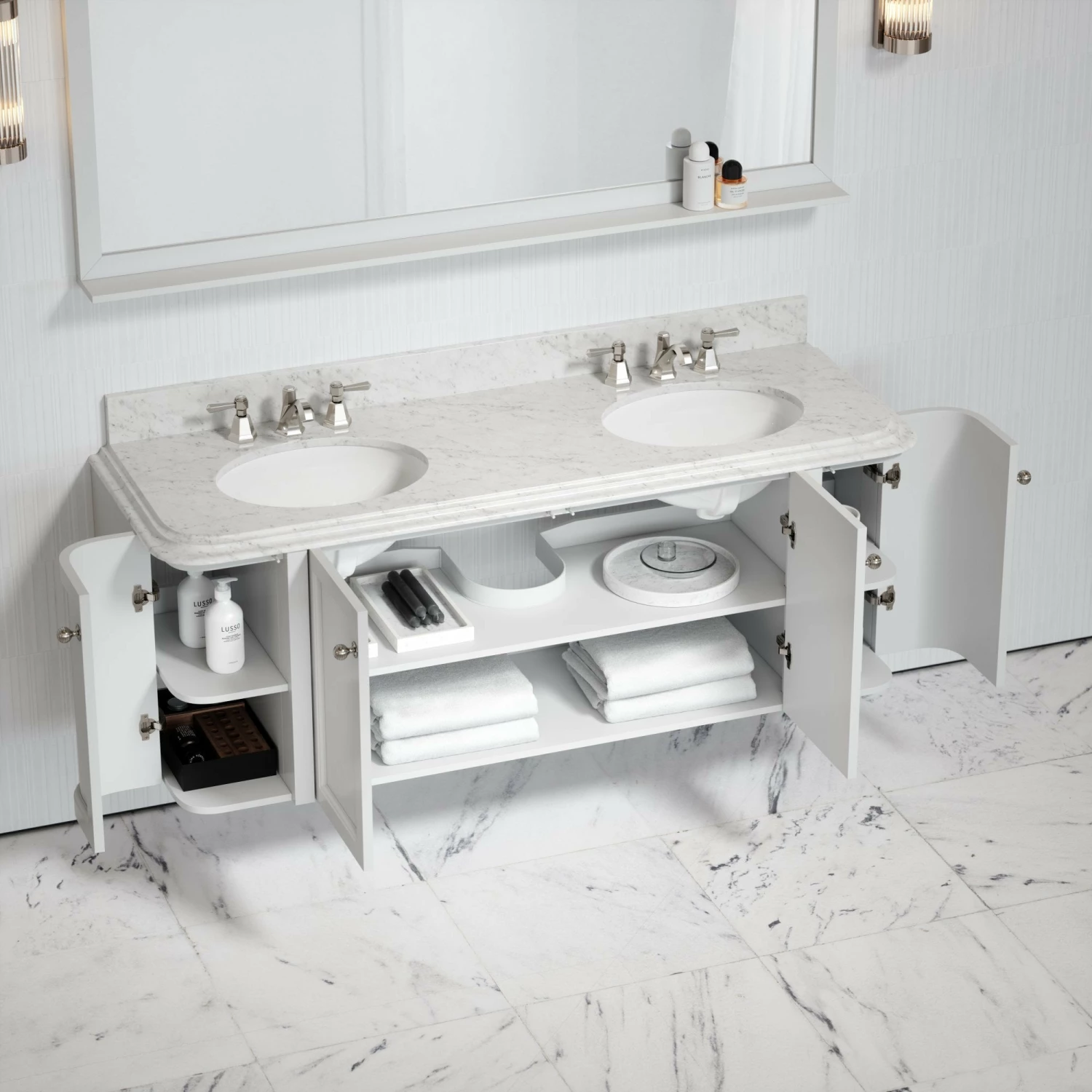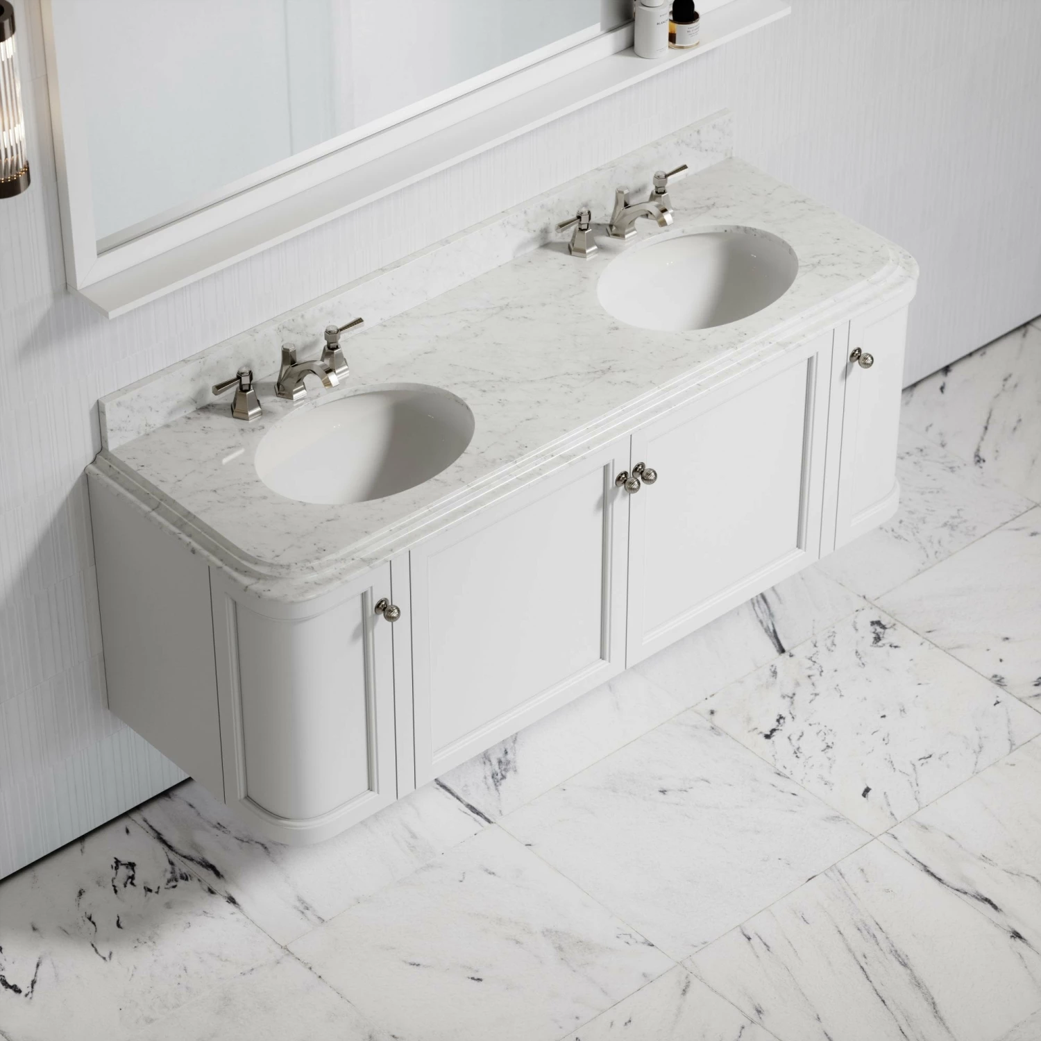Understated elegance is a key characteristic of our Deco collection and the Charsley vanity unit embodies this; defined by its geometric lines, curved edging and finished with our luxurious Carrara marble in a polished finish.