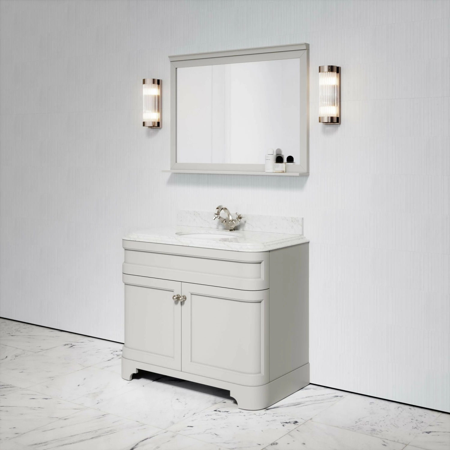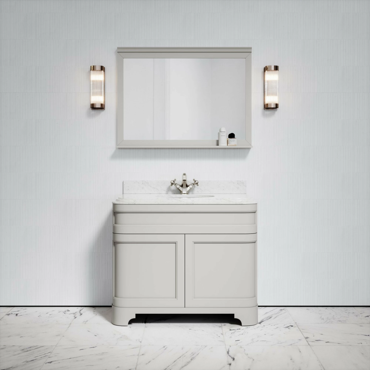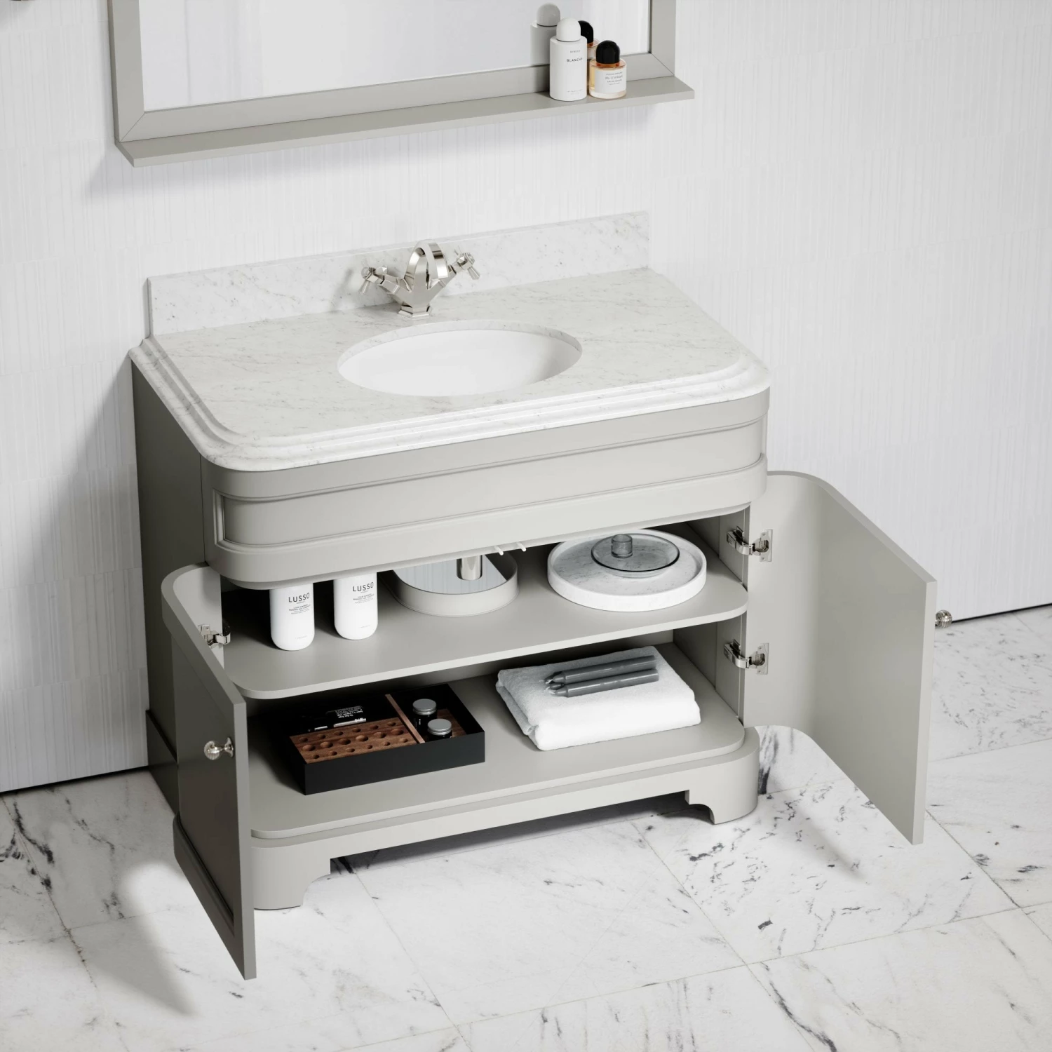 Crafted from marine grade plywood, the Connaught Freestanding Vanity Unit features stunning Italian polished marble atop its wood foundation, with a traditional built-in oval basin. The marble is finished with intricate cove ogee bevelled edging, in keeping with its 1920s influence.