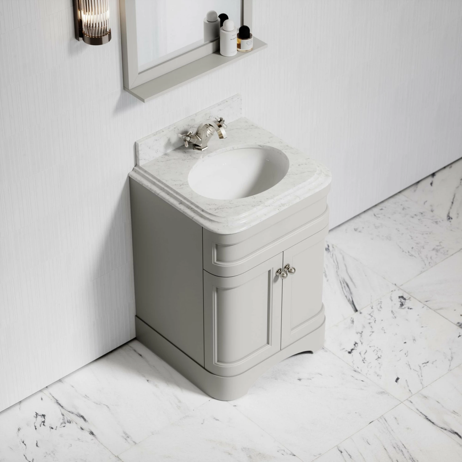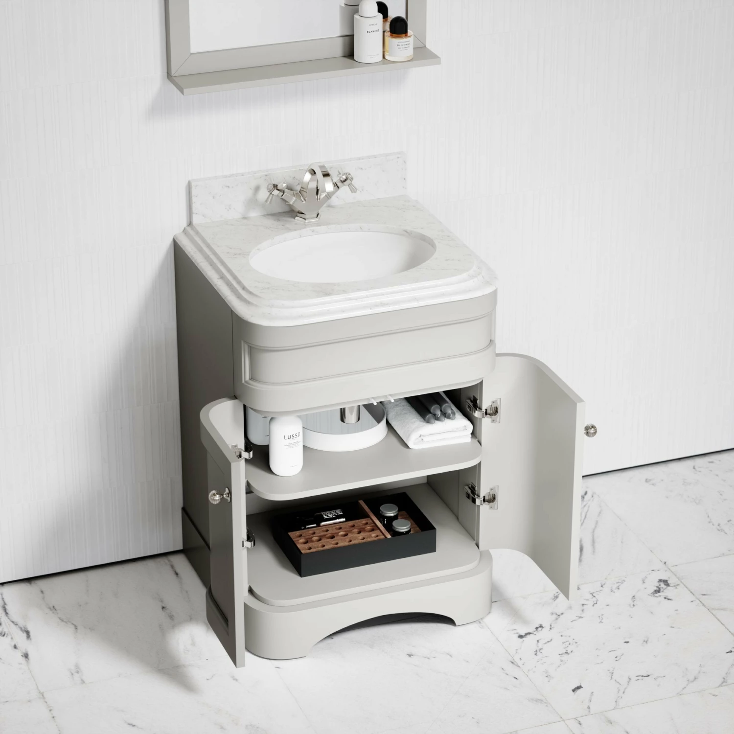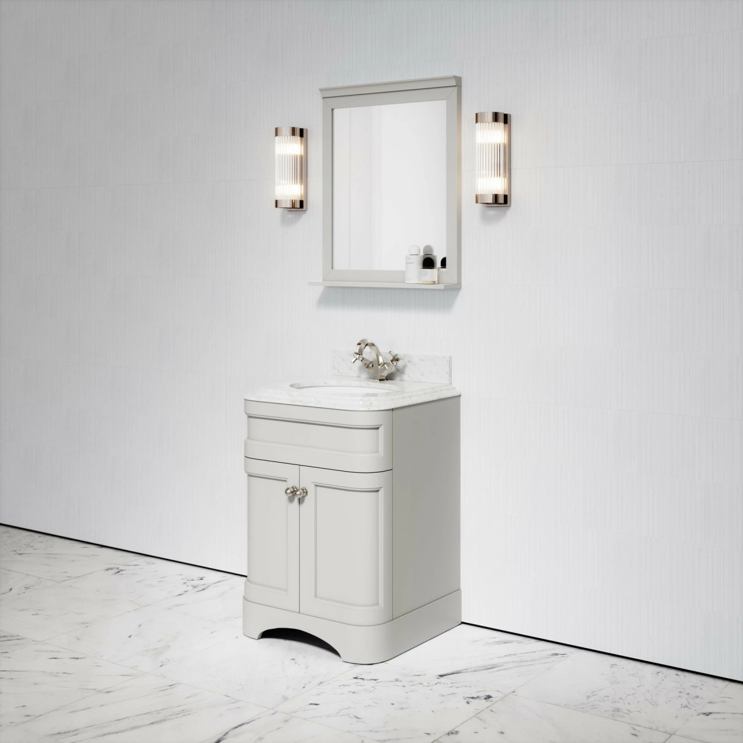 The Matte Stone Vanity Unit is crafted from durable marine grade plywood, coated in a soft matte stone finish, and is crowned by a beautiful polished Carrara marble countertop finely carved with cove ogee detailing. Alongside this, the vanity unit features an undermount oval basin and curved arch stand, in keeping with its Art Deco influence.
