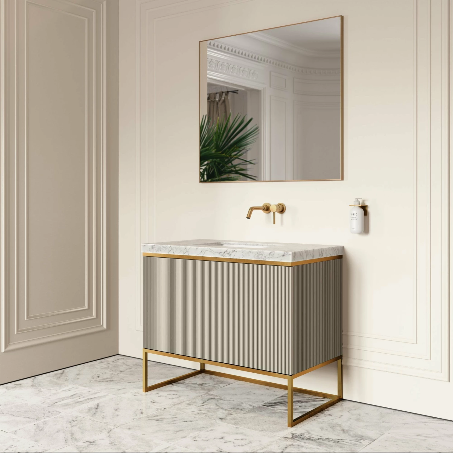 Defined by its strong geometrics, striking gold frame and contemporary fluting, the Couture Vanity Unit is a product of grandeur, and is heavily inspired by the architectural themes of some of Paris’ most luxury high-fashion houses.
