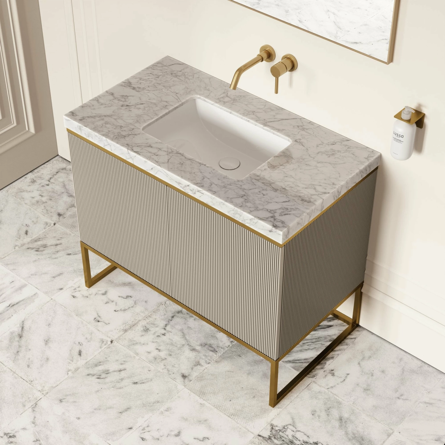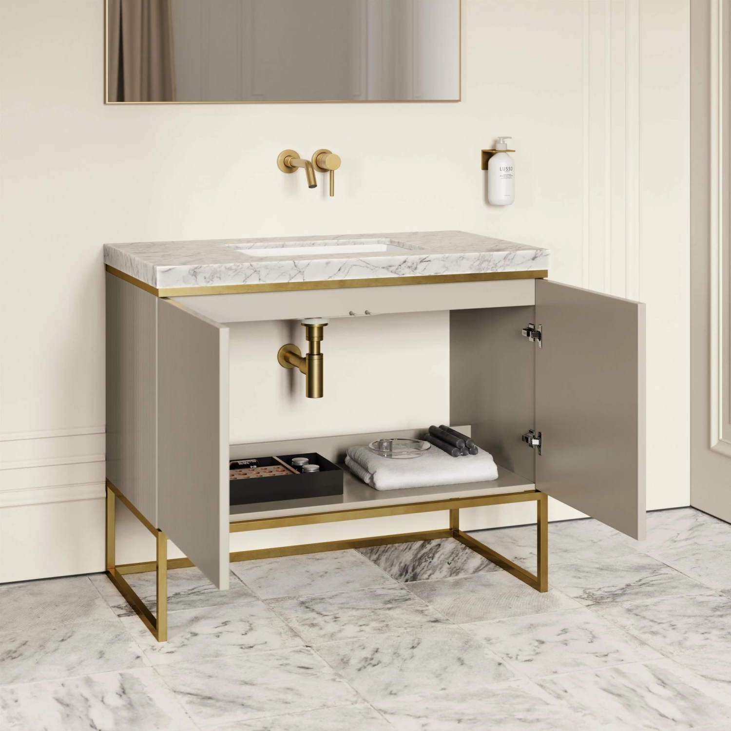 The Couture collection has been completely designed in-house by our CEO and founder and is the latest range of modern furnishings to be introduced to the Lusso collection. The vanity unit, matching the beauty cabinet of the same name, explores perfect use of texture and materials, including fluted woodwork, solid Art Deco-style gold framing and a crowning of the sustainably sourced Italian Carrara marble.
