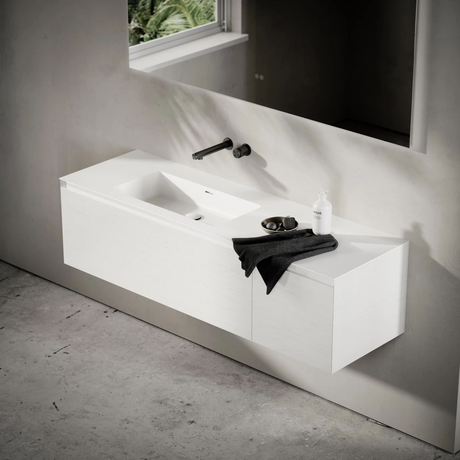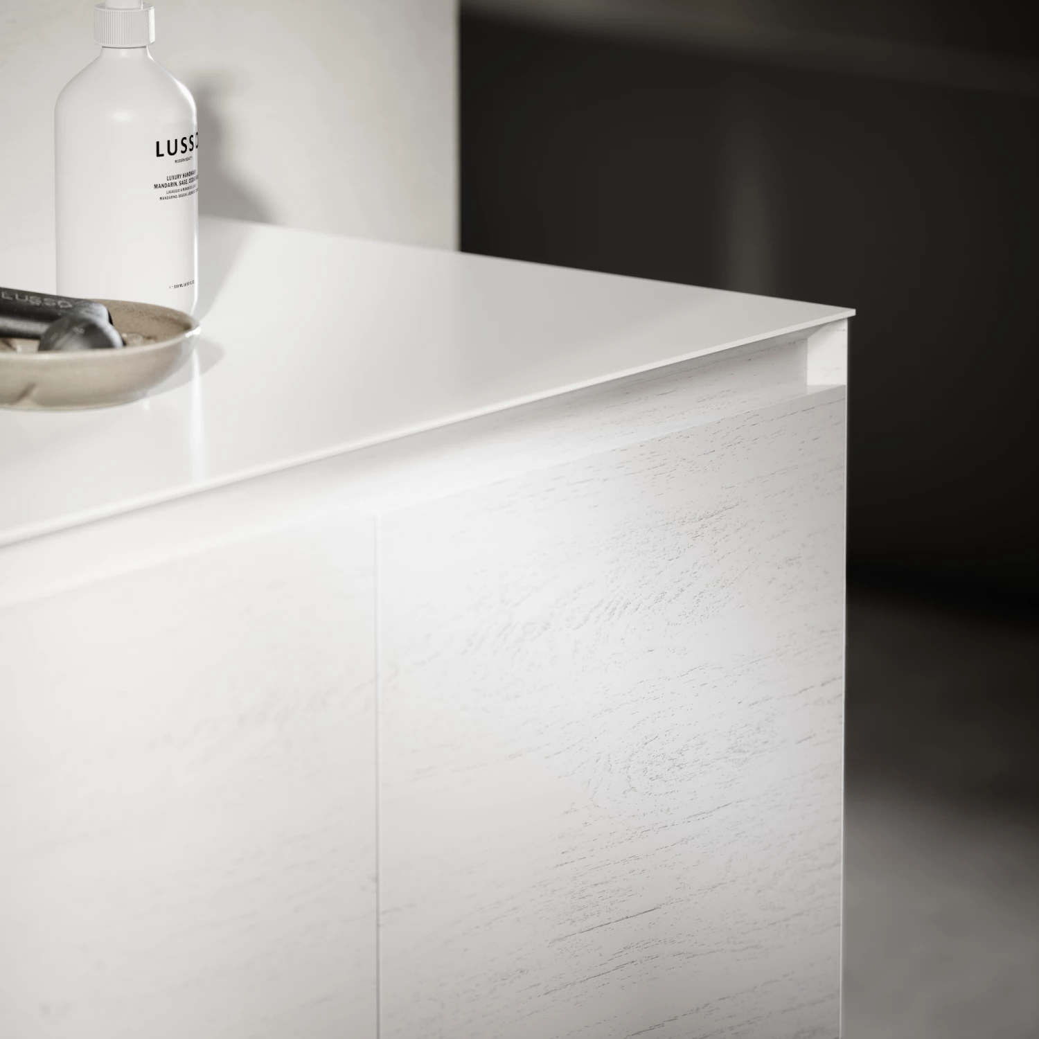 The Cubik Wood Grain Vanity Unit showcases elements of modern design and contemporary woodwork with a timeless white finish.