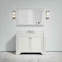 The bathroom vanity unit showcases intricate detailing and impeccable craftsmanship that reflect its traditional inspiration. Made from marine grade plywood, the vanity unit is coated in a matte cream finish and features a countertop carved from luxury polished Italian Carrara marble.