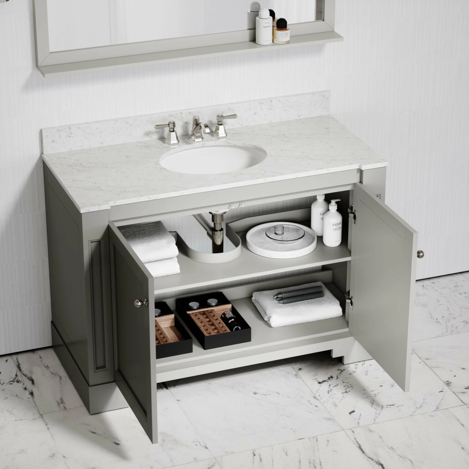Crafted from marine grade plywood to ensure the highest of standards, the Eaton Vanity Unit has also been coated in a matte stone finish for unmatched excellence, as well as showcasing a beautiful Italian polished Carrara marble countertop, complete with a built-in oval basin.
