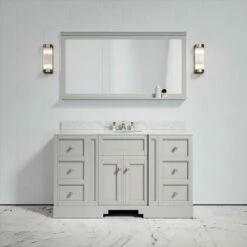 Made from durable and sturdy marine grade plywood, the Eaton Vanity Unit is coated in a soft matte stone finish to ensure protection and longevity. The freestanding vanity unit is also crafted with a countertop made from sustainably sourced polished Carrara marble with a built-in oval-shaped ceramic basin.