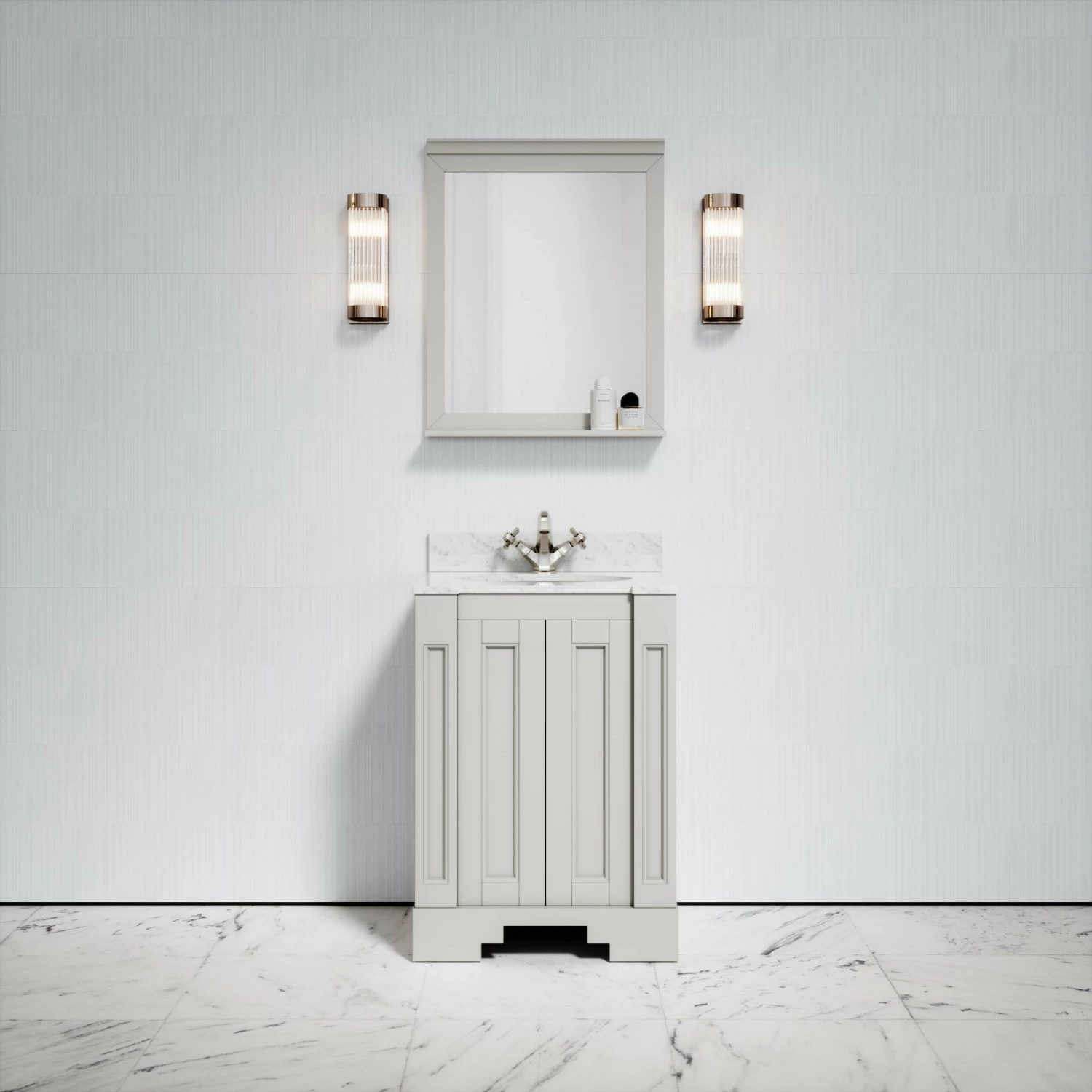 Crafted using marine grade plywood and finished in a matte stone coating, the freestanding vanity unit also features beautiful Italian polished Carrara marble surrounding a built-in basin, with structural edging showing similarity to the architecture of Art Deco.