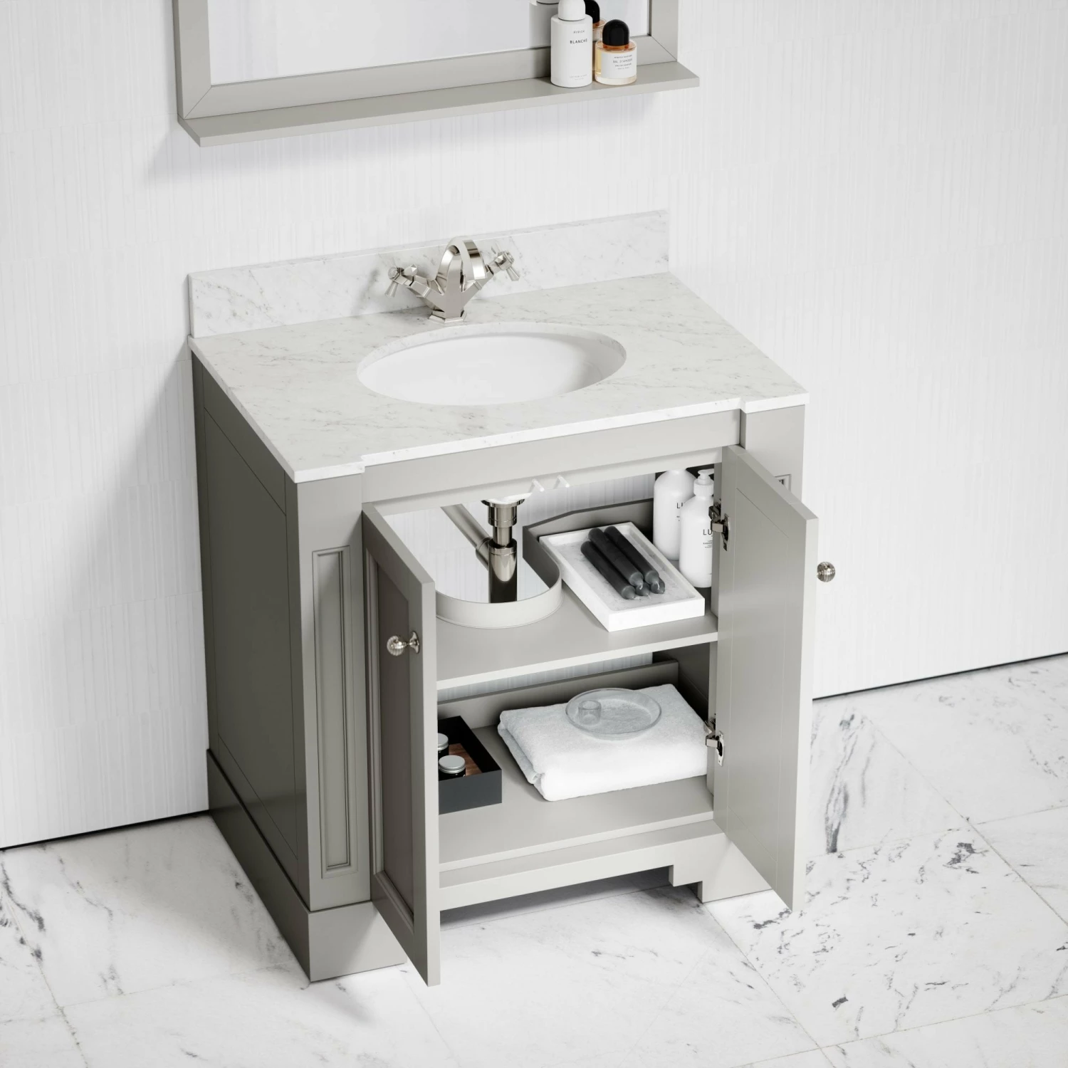 The freestanding vanity unit is coated in a muted matte stone finish that contrasts beautifully with the polished Carrara marble countertop, sustainably sourced from Italy. The cabinet is also crafted using marine grade plywood, ensuring moisture resistance and longevity.