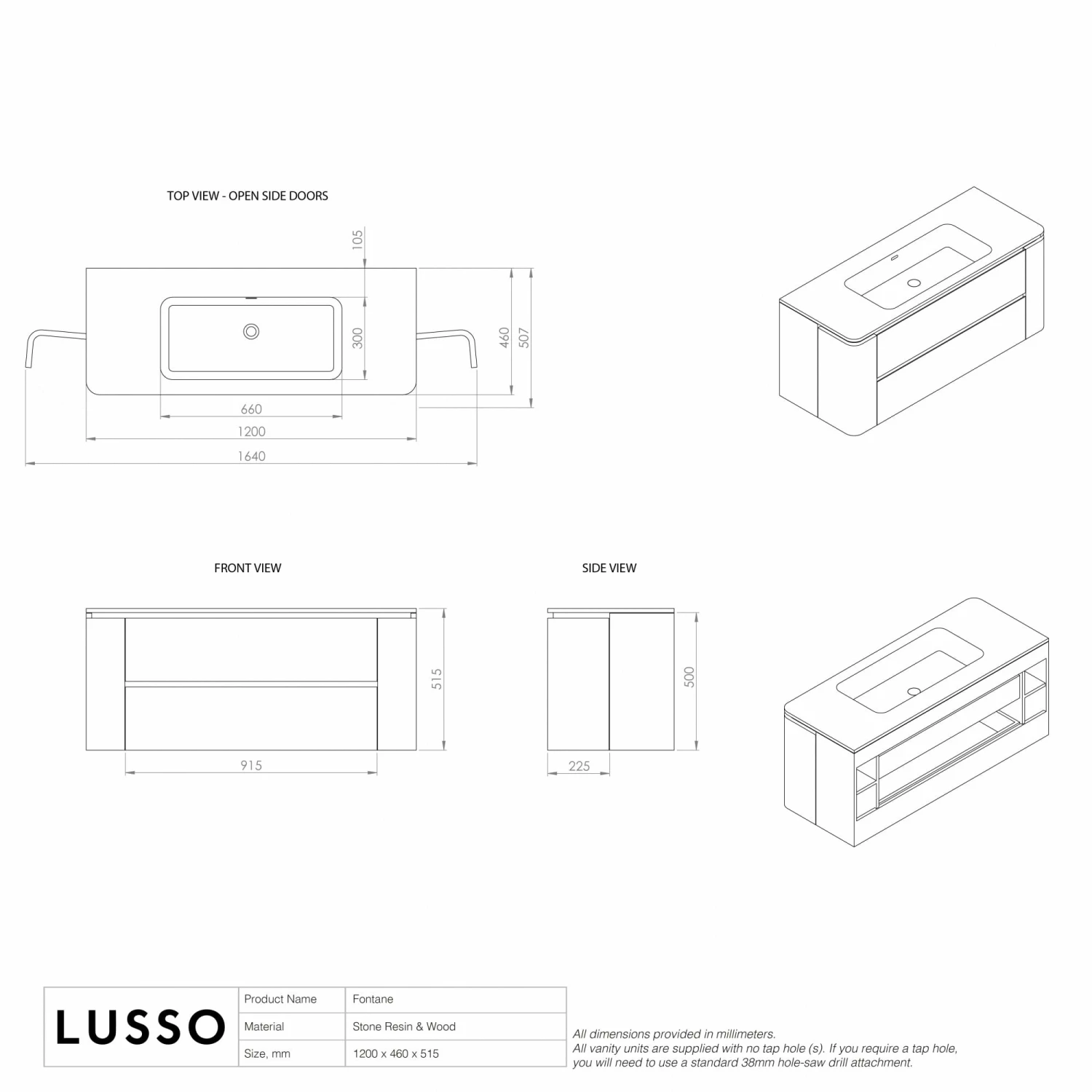 The basin is supplied with no tap hole so you have the option to install a wall mounted tap. Due to the nature of our material, a tap hole can be drilled using a standard 38mm hole saw drill attachment.
