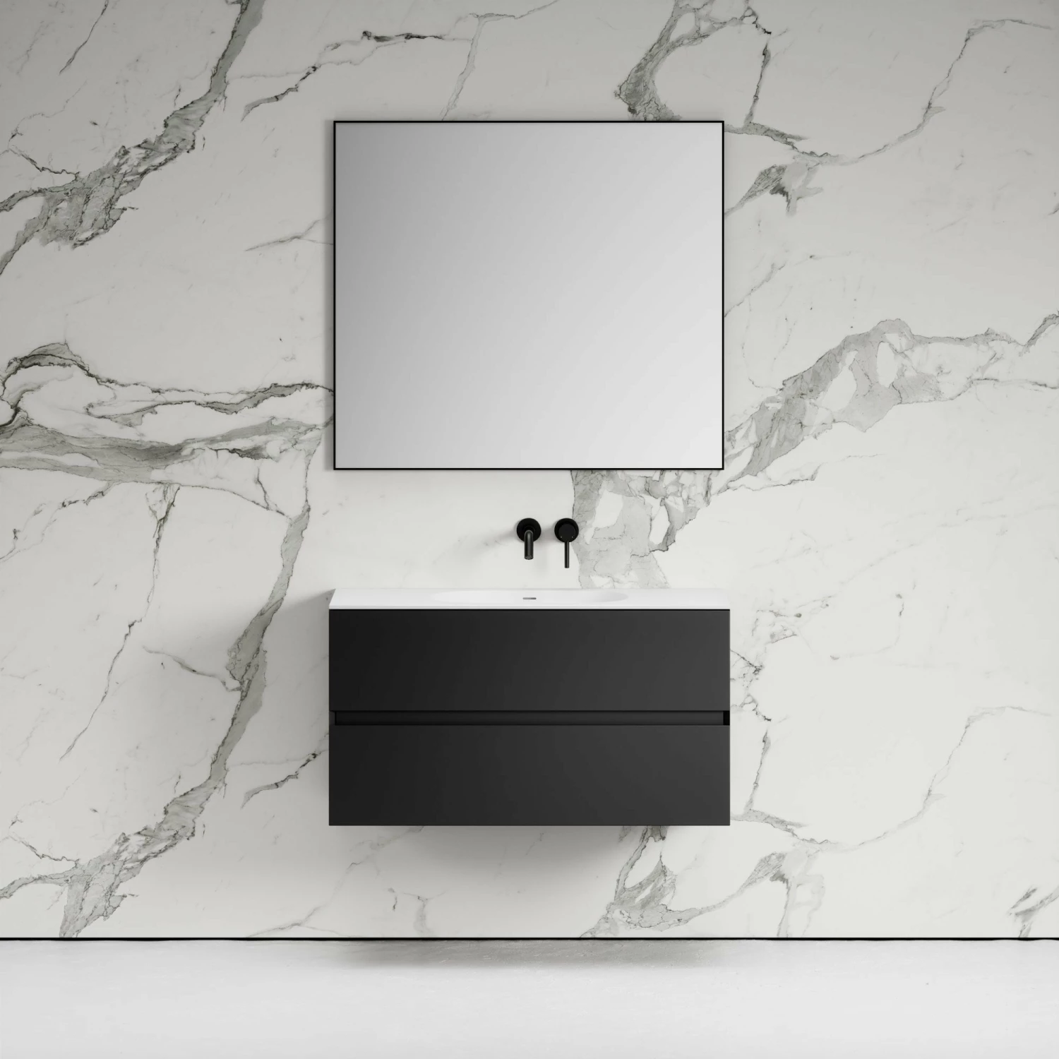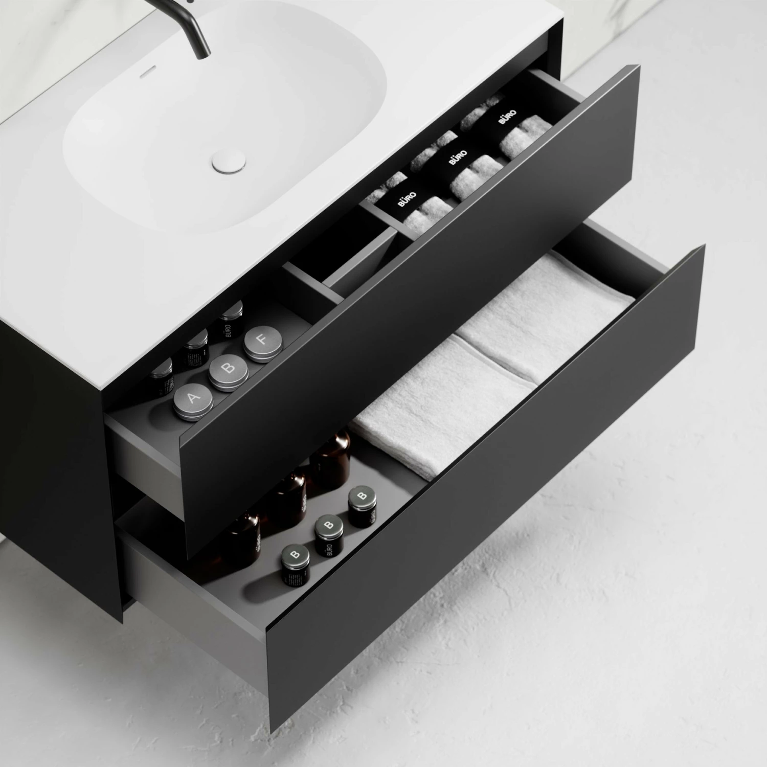 The Lusso Gobain Wall Hung Vanity Unit in striking matte black is contemporary luxury defined. With a strong, clean-lined silhouette, the Gobain wall hung vanity unit (with stone basin included) manages to achieve modern grandeur which instantly elevates your interior. Designed to our impeccably high standards, this statement piece is perfect for any space where an industrial aesthetic is key. Supplied with an integrated Lusso basin and soft-close drawer, you can choose seamless style that is complemented by other pieces from our luxurious bathroom collection.