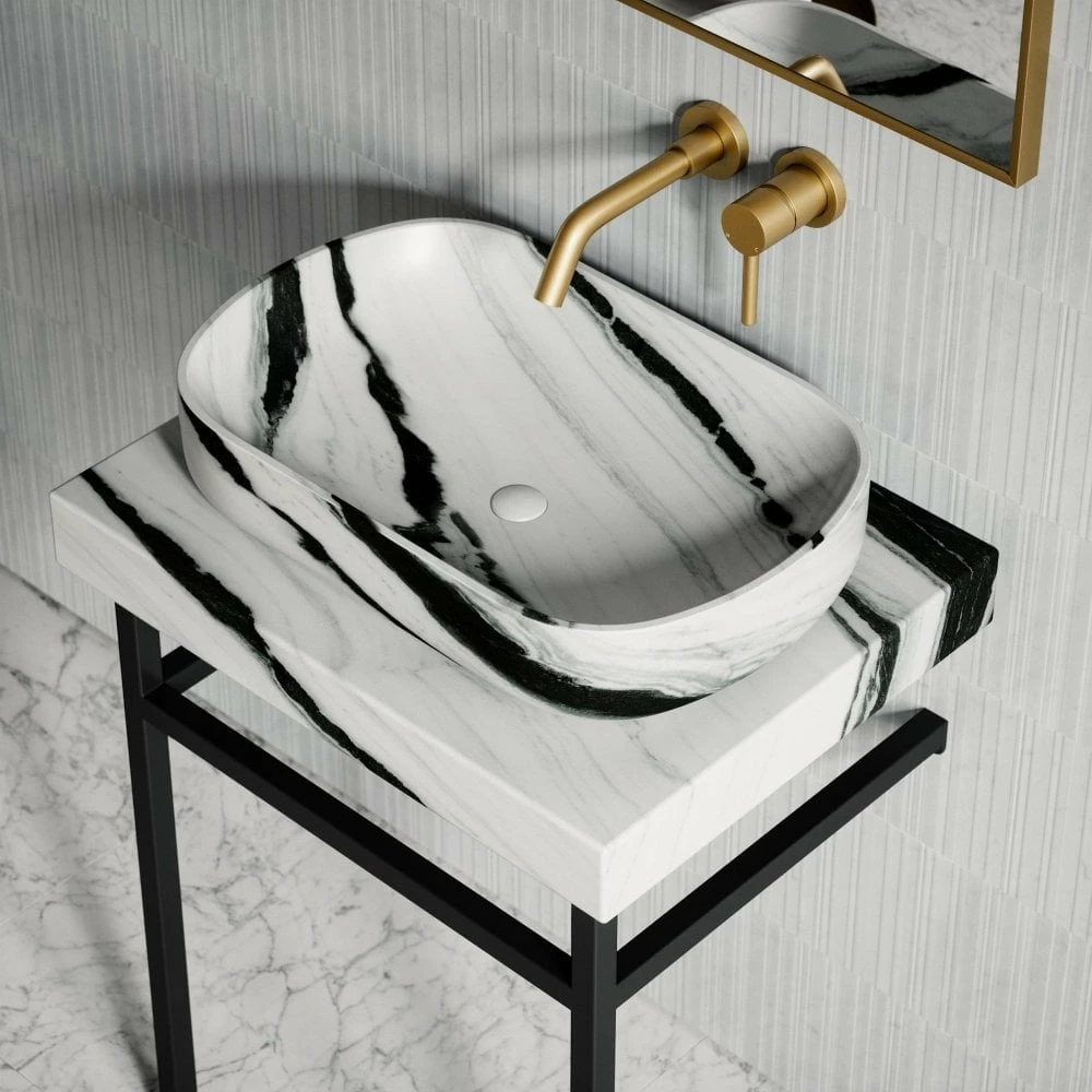 Boasting a high-quality finish, Panda Marble originates from China. A unique surface with a vast crisp white background accompanied by broad weaving of contrasting black and gunmetal grey swathes. Every so often, conditional to each independent marble block, moments of heritage green and occasions of tanned almond hues are revealed; an undeniable way to add marvellous character to a bathroom. Due to the organic formation of marble, the proportion and arrangement of veining can range from intense heavily concentrated areas to sparse pure white with less dense black markings.