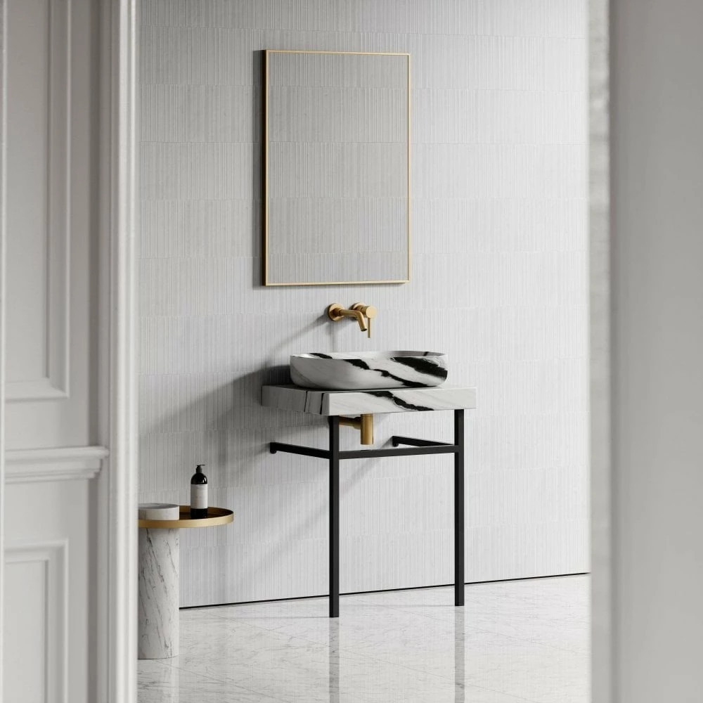 Elevate your everyday routine with the indulgent addition of this bold and beautiful vanity, mounted upon a sleek black steel frame. Incredibly handsome, the Lomazzo Freestanding Vanity Unit is an excellent selection for inviting smooth understated style to any bathroom.