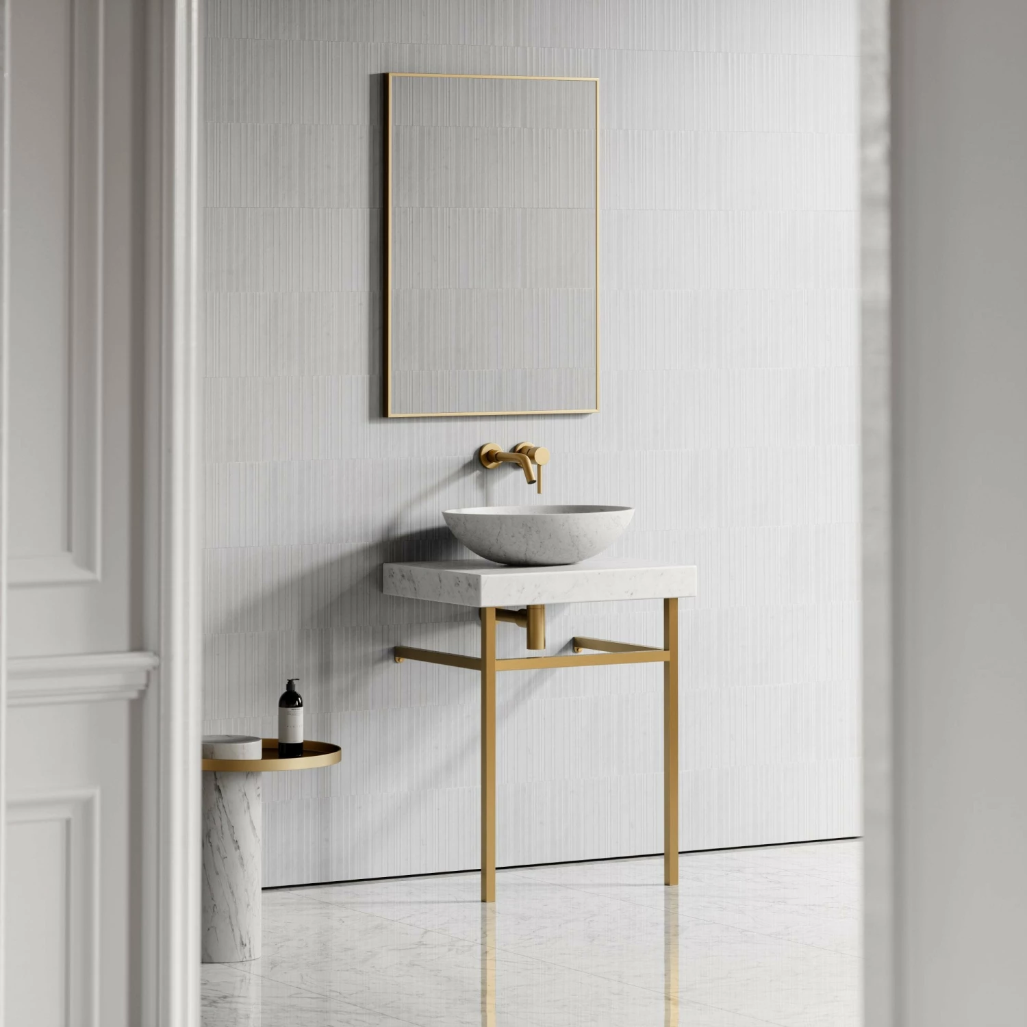 The Lomazzo Countertop Vanity Unit features a striking brushed gold framing and a Carrara marble countertop – one of Italy’s finest forms of marble. This freestanding cloakroom vanity unit can be topped by an opulent Carrara marble basin from the Lusso collection such as the Perlato or the Italia.