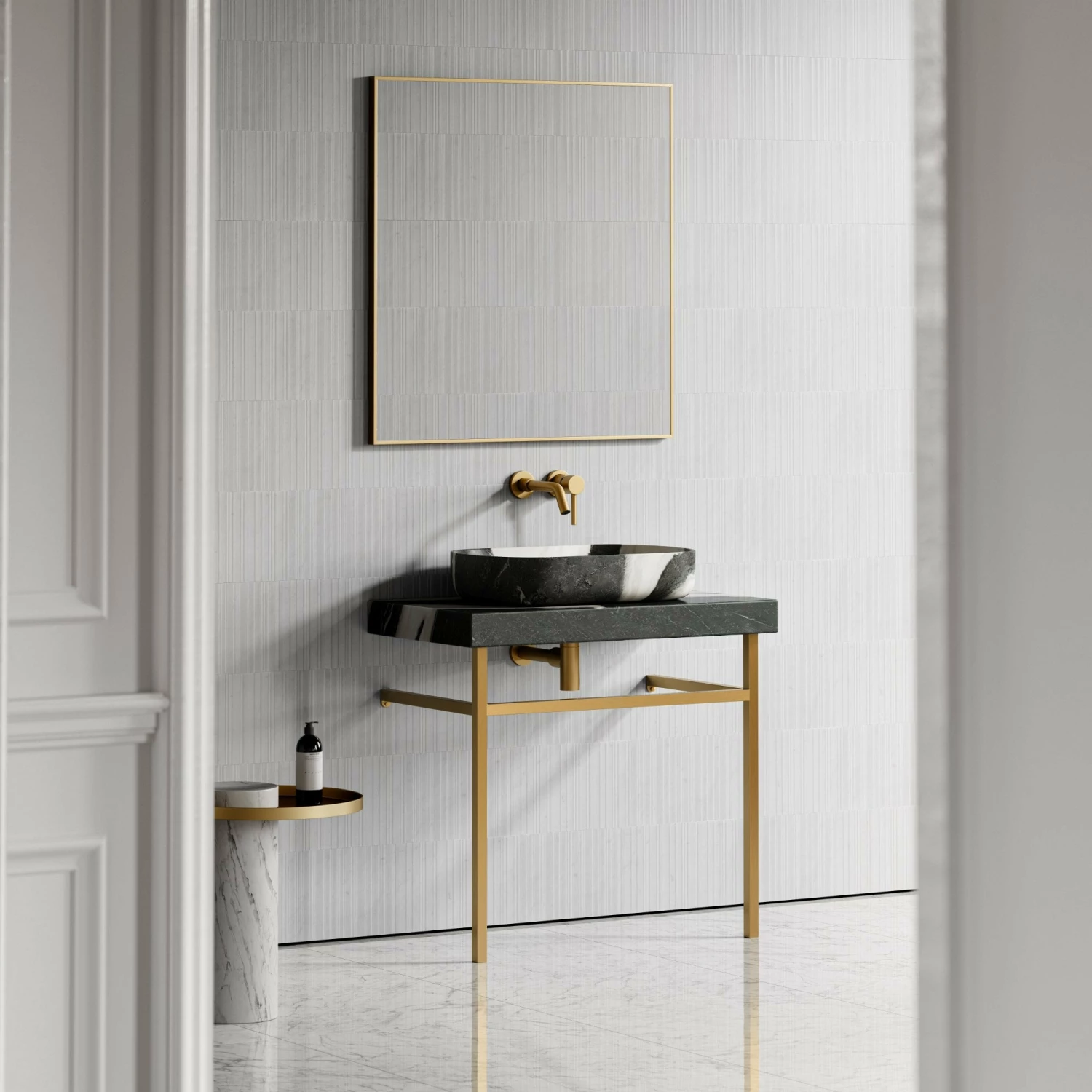 Displaying brushed gold legs and a striking countertop crafted from the distinct Panda marble, the vanity offers timeless appeal and glamour. Pair your vanity unit with a Panda marble countertop basin such as the Designo or take the theme further and complete with our Panda basin taps from the Lusso Porto range.