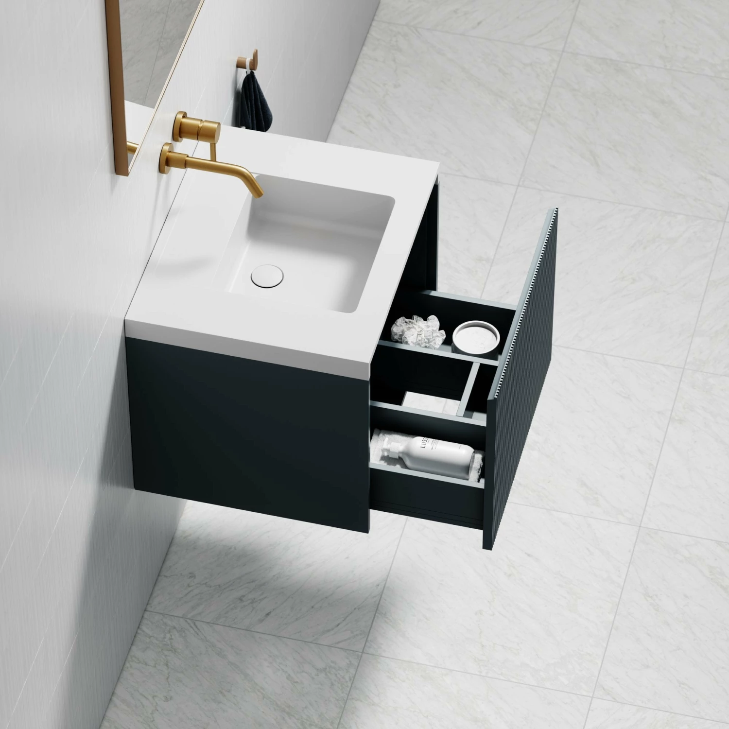 The wall mounted vanity unit is crafted with soft closing drawers that negate the need for handles, leaving all focus down to its beautiful fluted structure.