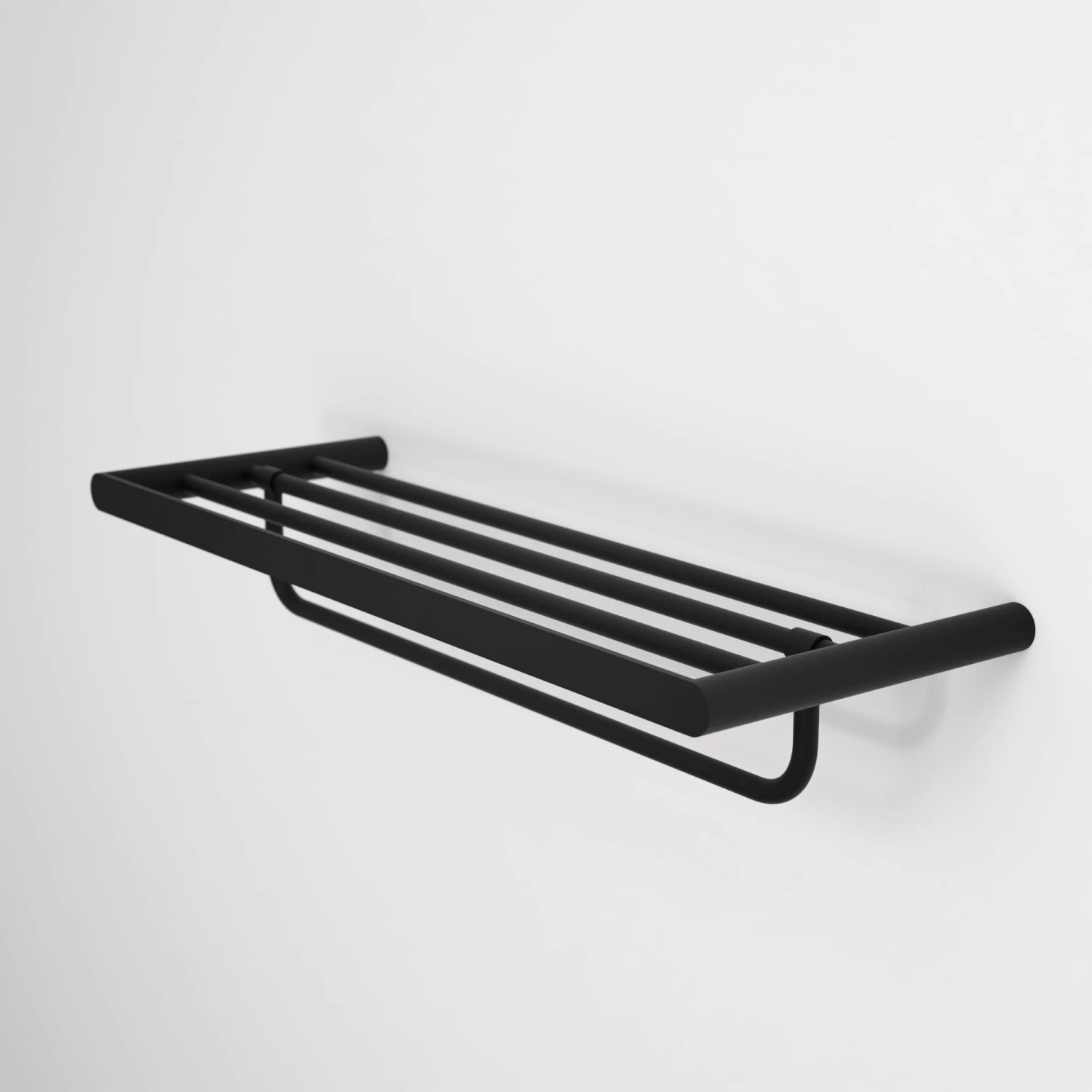 Contemporary elegance has never been so achievable thanks to our luxe matte black towel shelf with rail 600. Our team of artisan designers have created an array of products designed to elevate your bathroom. This matte black towel shelf with rail is the epitome of signature Lusso design, offering practical style to suit the modern home.