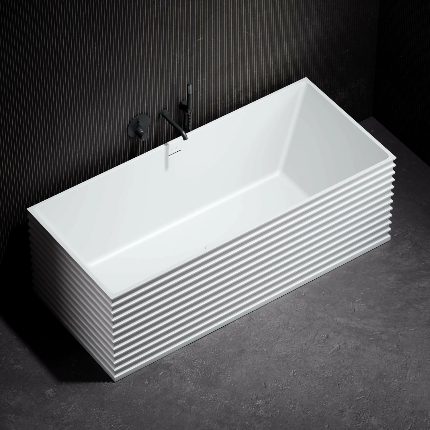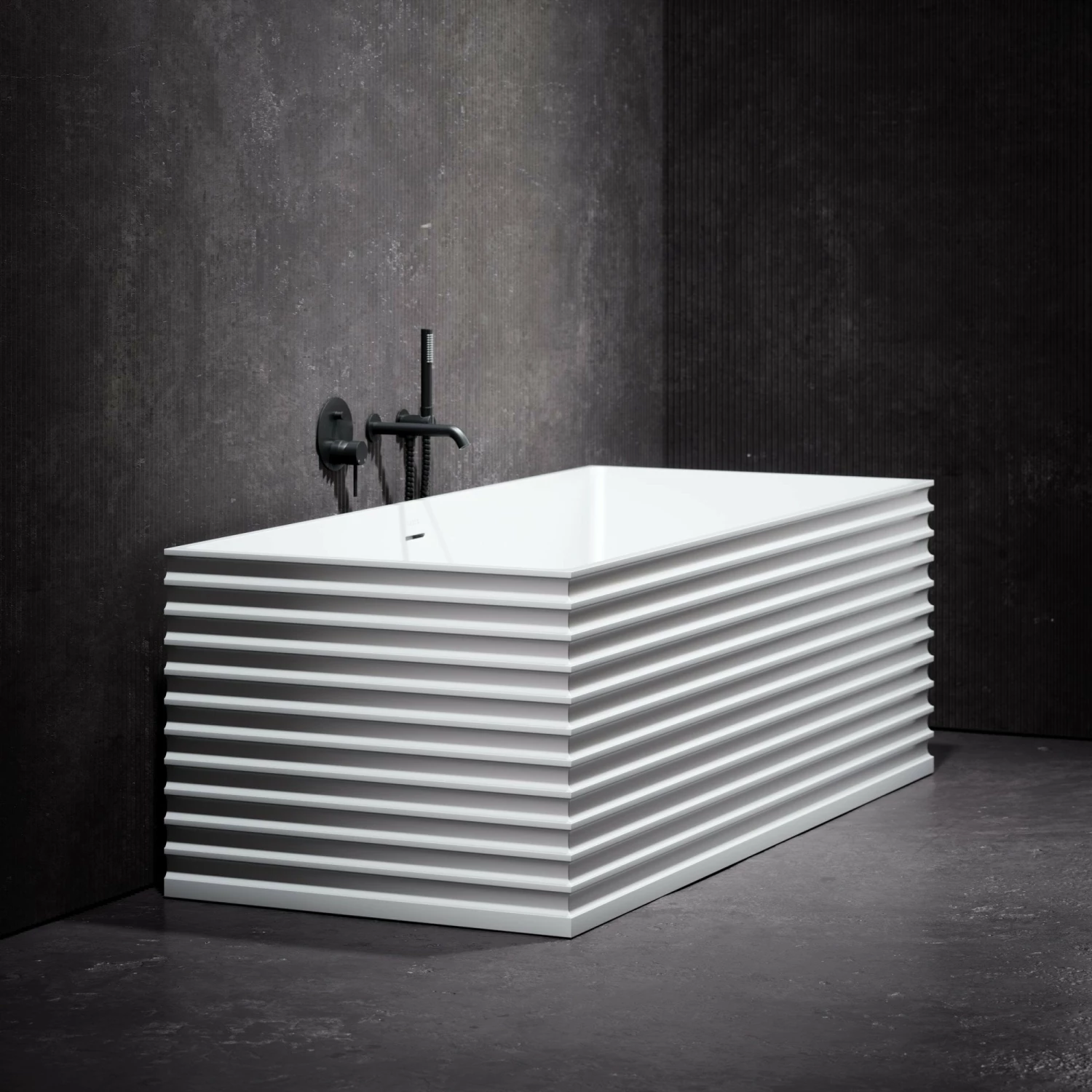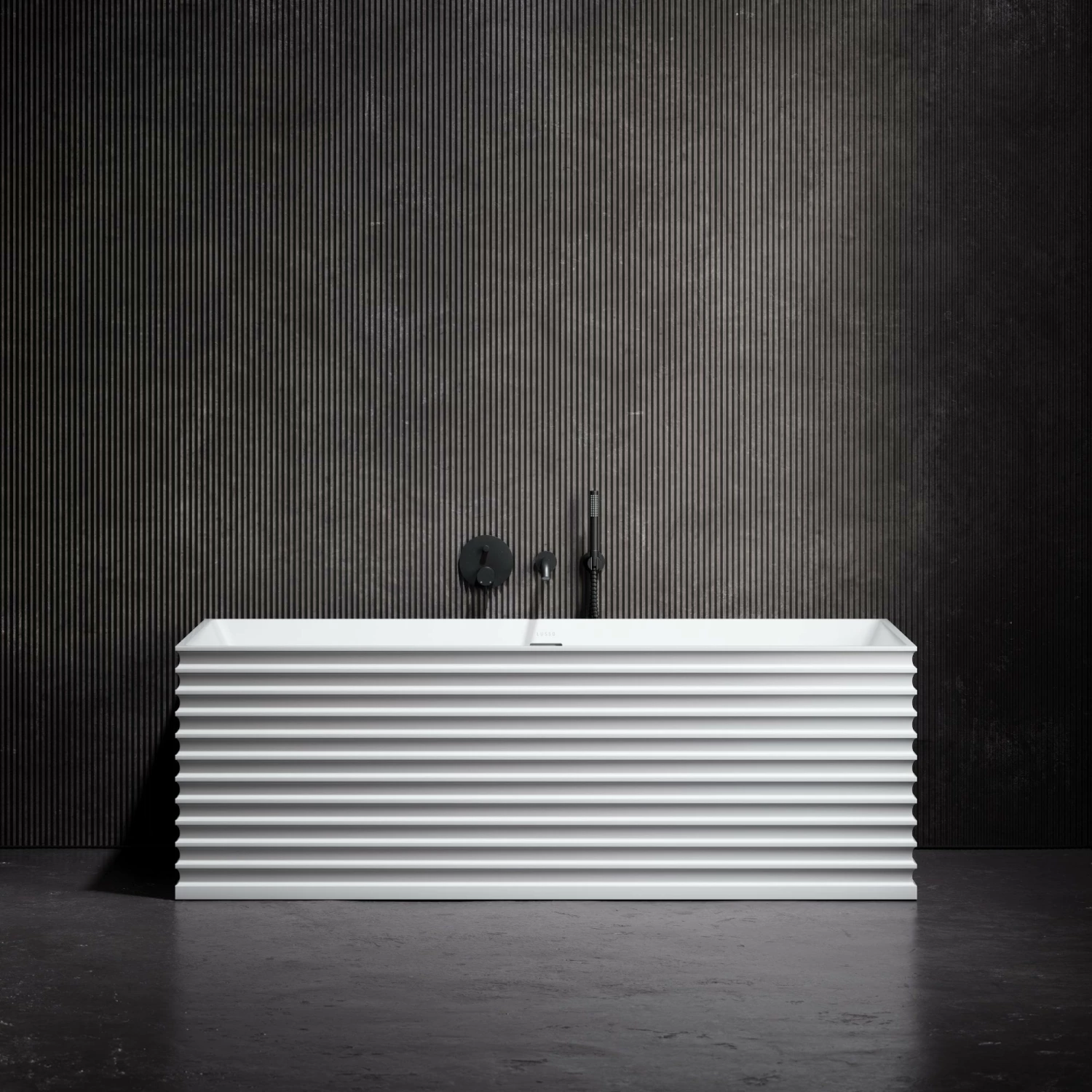 The bath boasts a distinct rectangular silhouette which can sit freestanding or close to the wall, perfect for modular bathrooms where space is limited or for those wanting to make a striking impact in a master bathroom. The Maddox stone tub finely displays sleek fluted edging, matching the basins of the same design.