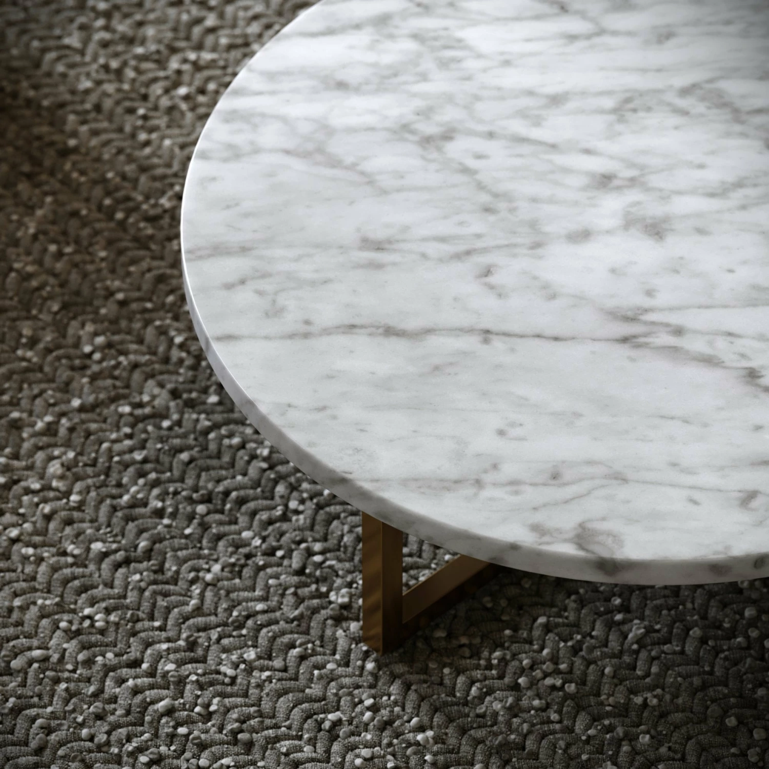 Crafted from the finest Carrara marble, the polished table boasts distinct swathes and markings, making the piece completely unique to any other of its kind, guaranteeing you a one-of-a-kind piece for your interior. The table is finished with linear geometric legs, adding an element of Art Deco glamour to the modern design.