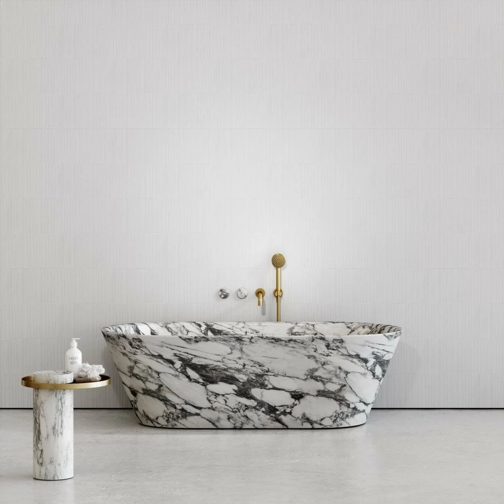 Designed in house as part of our newly launched Porto range, the bath filler is crafted to work cohesively with other Lusso and Pietra products, featuring Arabescato marble that’s carved from the same blocks used for our Arabescato basins and baths, resulting in similar markings and tones to other products from the collection.