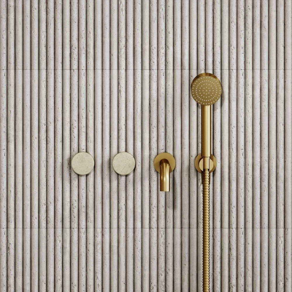 The wall mounted bath filler, showcasing a bath tap and handheld shower, has been created using progressive mixer technology, allowing temperature and flow control from the single levers, and ensures efficiency and sustainability through the reduction of hot water wastage The Crema Marfil levers have been carved from the same blocks as the marble used to create our baths and basins, meaning that the products show similarity in colour and markings, perfect for styling with each other.