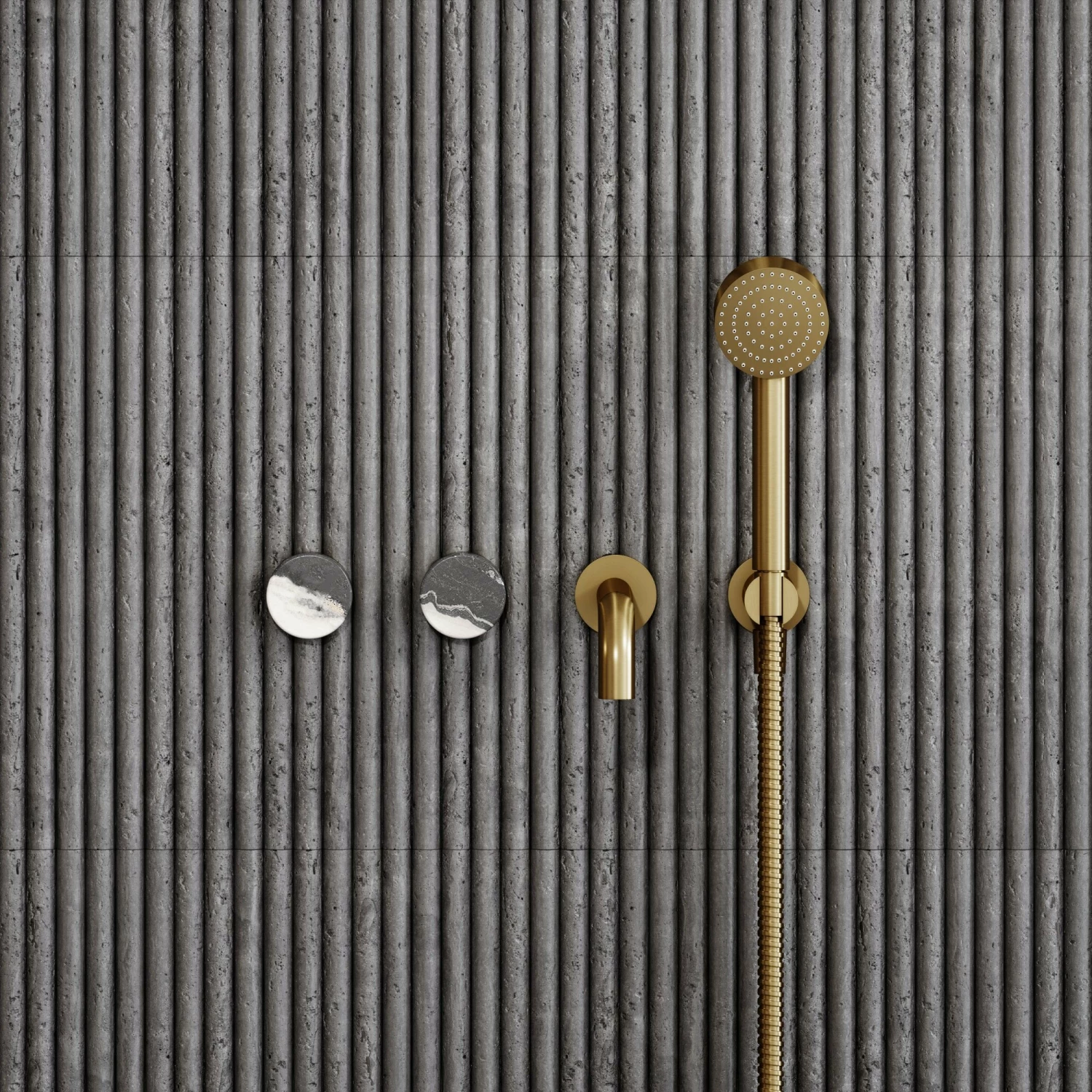 The wall-mounted bath filler, showcasing a bath tap and handheld shower, has been created using progressive mixer technology, allowing temperature and flow control from the single levers, and ensuring efficiency and sustainability through the reduction of hot water wastage The Panda levers have been carved from the same blocks as the marble used to create our baths and basins, meaning that the products show similarity in colour and markings, perfect for styling with each other.