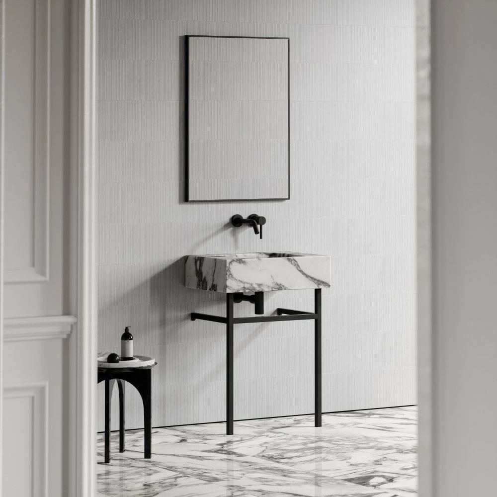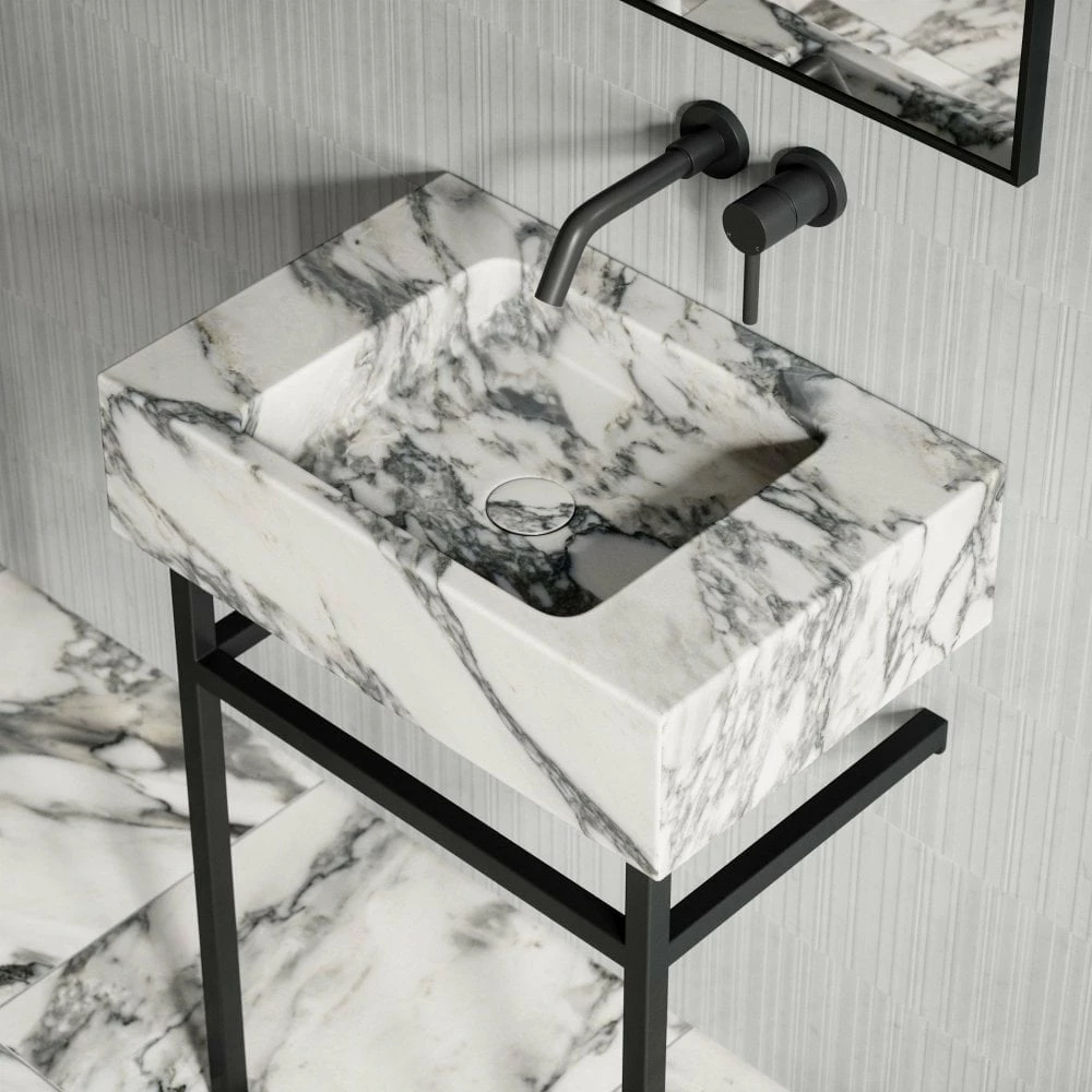 An indulgent expanse of solid marble creates this captivating basin floating serenely a-top its sleek black legs. Flaunting an effortless silhouette, the Vernante has a weightless appeal thanks to its slender stainless steel frame.