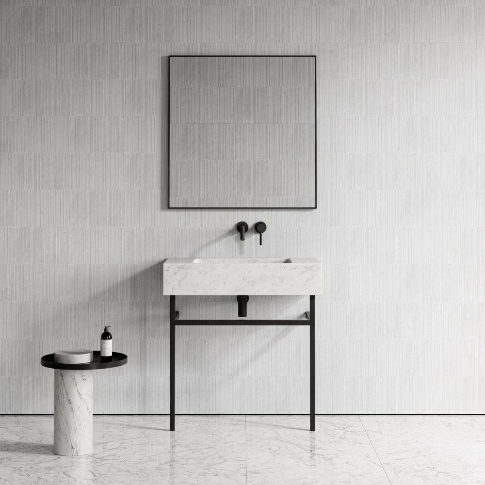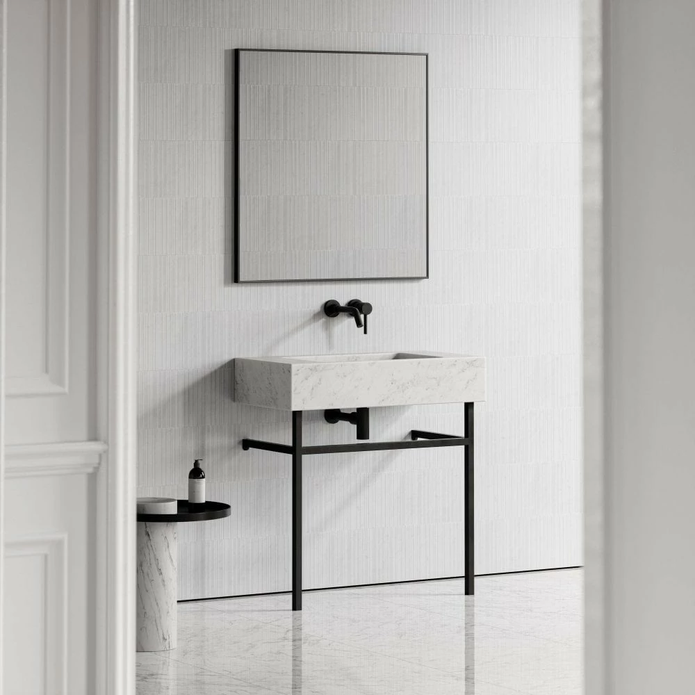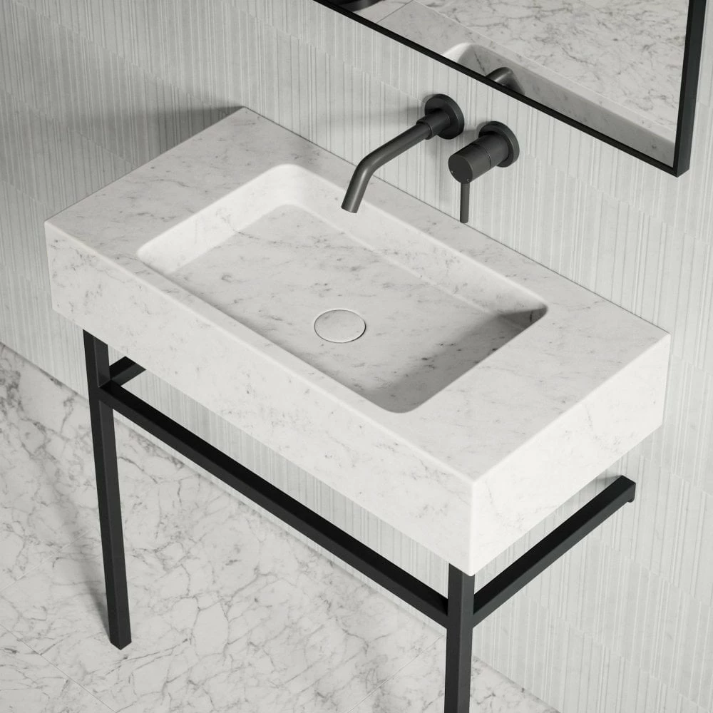 Make superior impact whilst creating a feeling of space with the splendour of the larger Vernante. A solid marble integrated basin floats handsomely a-top its satin black steel frame design. Eye-catching and distinctive, its quiet sleek legs add contemporary glamour to the entire piece.