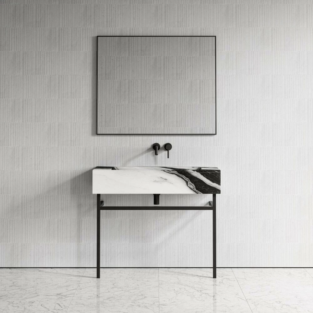 An indulgent expanse of solid marble creates this captivating elongated basin floating serenely a-top its sleek black legs. Flaunting an effortless silhouette, the Vernante has a weightless appeal thanks to its slender stainless steel frame.