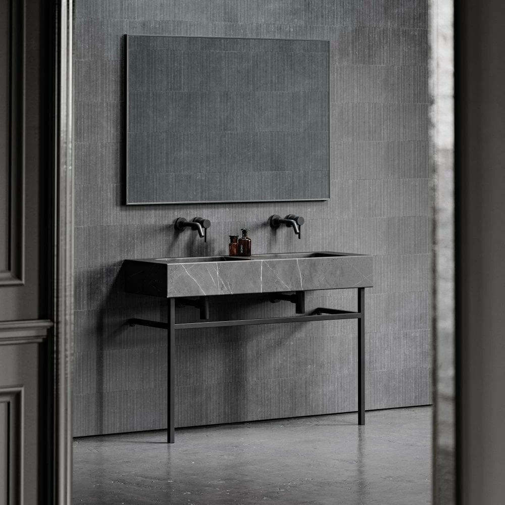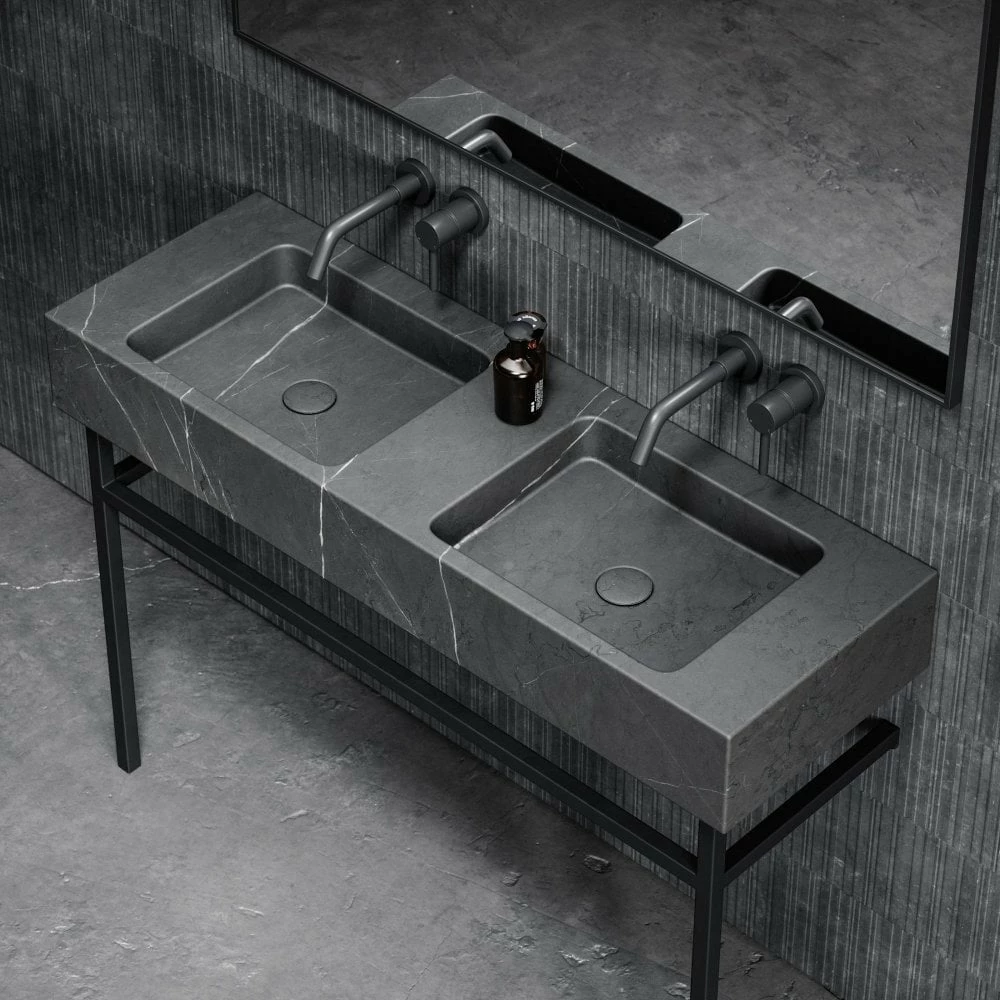 A consciously designed duo vanity, the charismatic double basins seamlessly sit a-top a weightless stainless steel structure. With a combination of smooth honed curves, the serene surface of marble, and soft satin legs; the double Vernante is a truly enriching piece which strives to incorporate stylish practical everyday use.