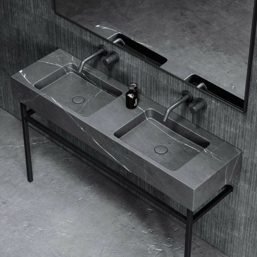 A consciously designed duo vanity, the charismatic double basins seamlessly sit a-top a weightless stainless steel structure. With a combination of smooth honed curves, the serene surface of marble, and soft satin legs; the double Vernante is a truly enriching piece which strives to incorporate stylish practical everyday use.