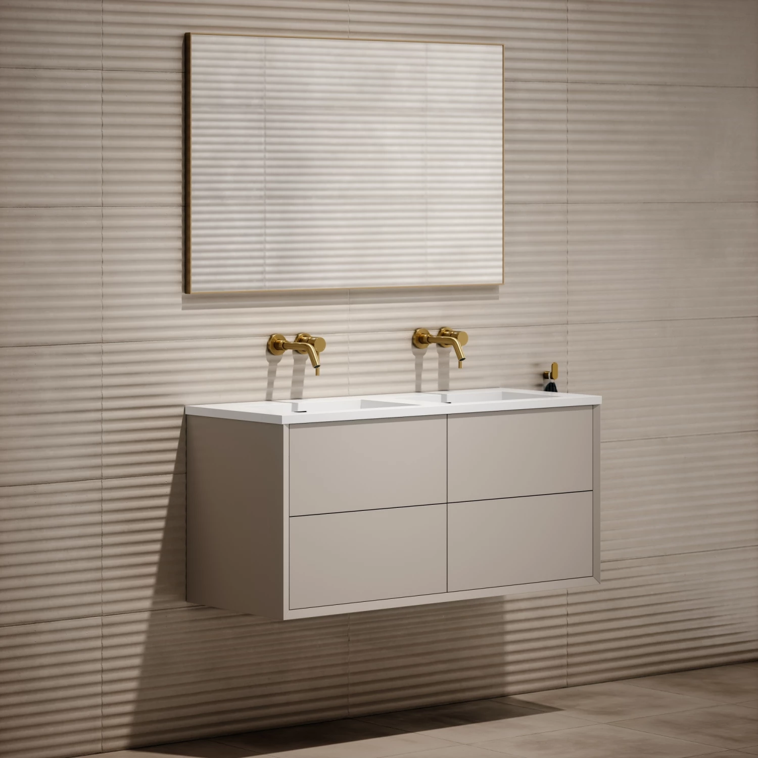 The stunning Volini Double Vanity Unit (with stone basin included) makes a striking appearance, effortlessly elevating any bathroom interior. Built in with Lusso’s signature double stone basins, ideal for couples and family bathrooms. This 1200mm wall hung vanity unit offers generous storage space perfect for uncluttered living, saving you space and maintaining a clean, minimal aesthetic.