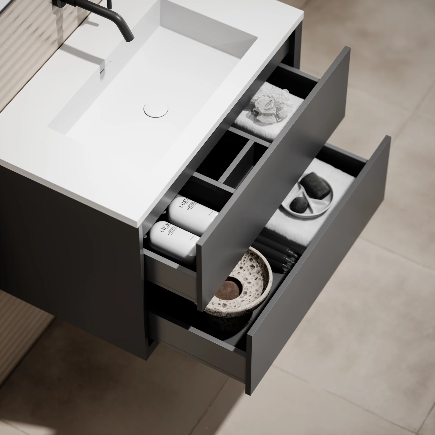 Elegant and striking, the Lusso Volini Bathroom Vanity Unit (with stone basin included) is a luxury addition to your modern interior. The contemporary dark hue will create a focal point in any space, adhering to the minimalistic aesthetic with the bevelled edge design and generous storage drawers. The Lusso Volini Wall Hung Vanity Unit incorporates a classic Lusso basin, fusing effortless style and function to elevate even compact interiors.