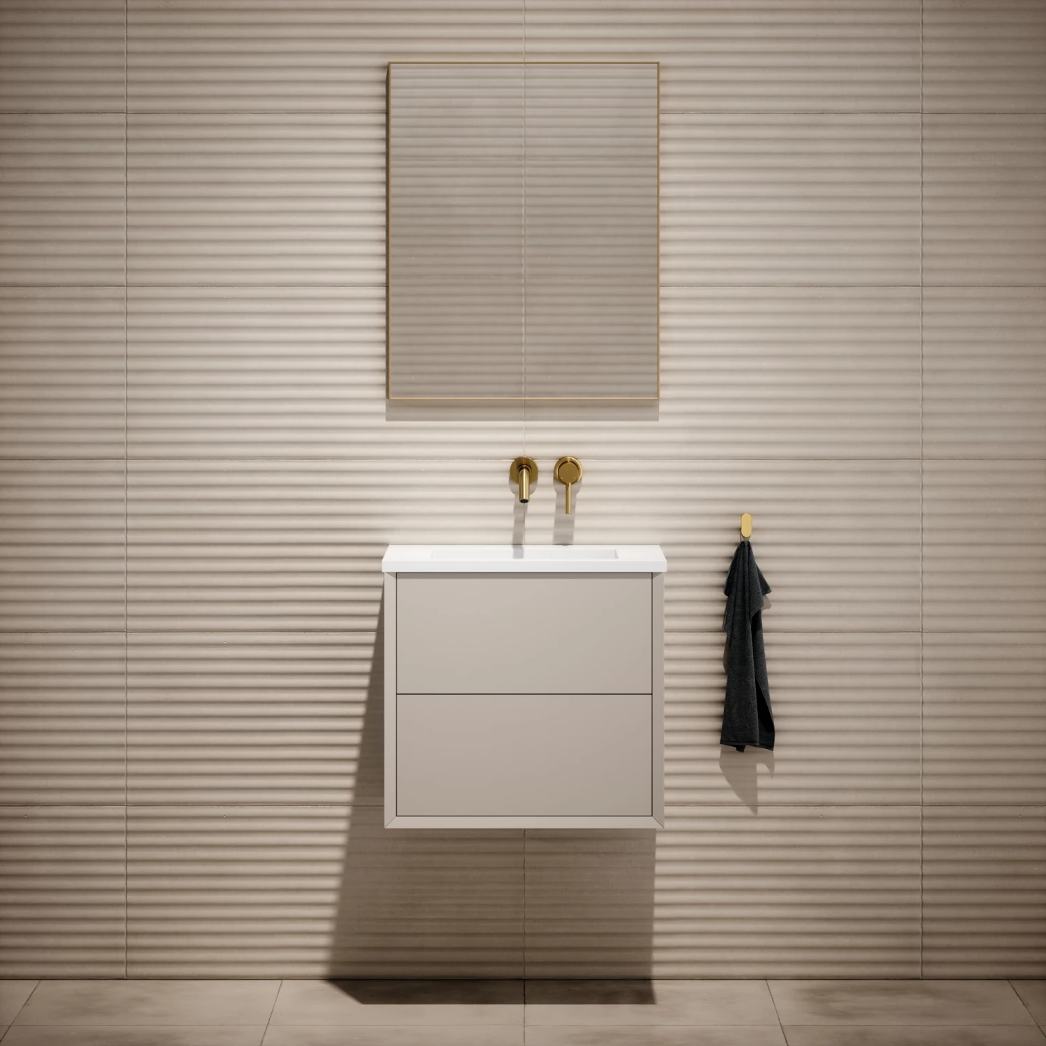 This Wall Hung Vanity Unit is manufactured to a very high standard featuring a luxurious bevelled edge design. The drawers are opened by a spring release blum drawer system and the basin is made from white matte composite stone.