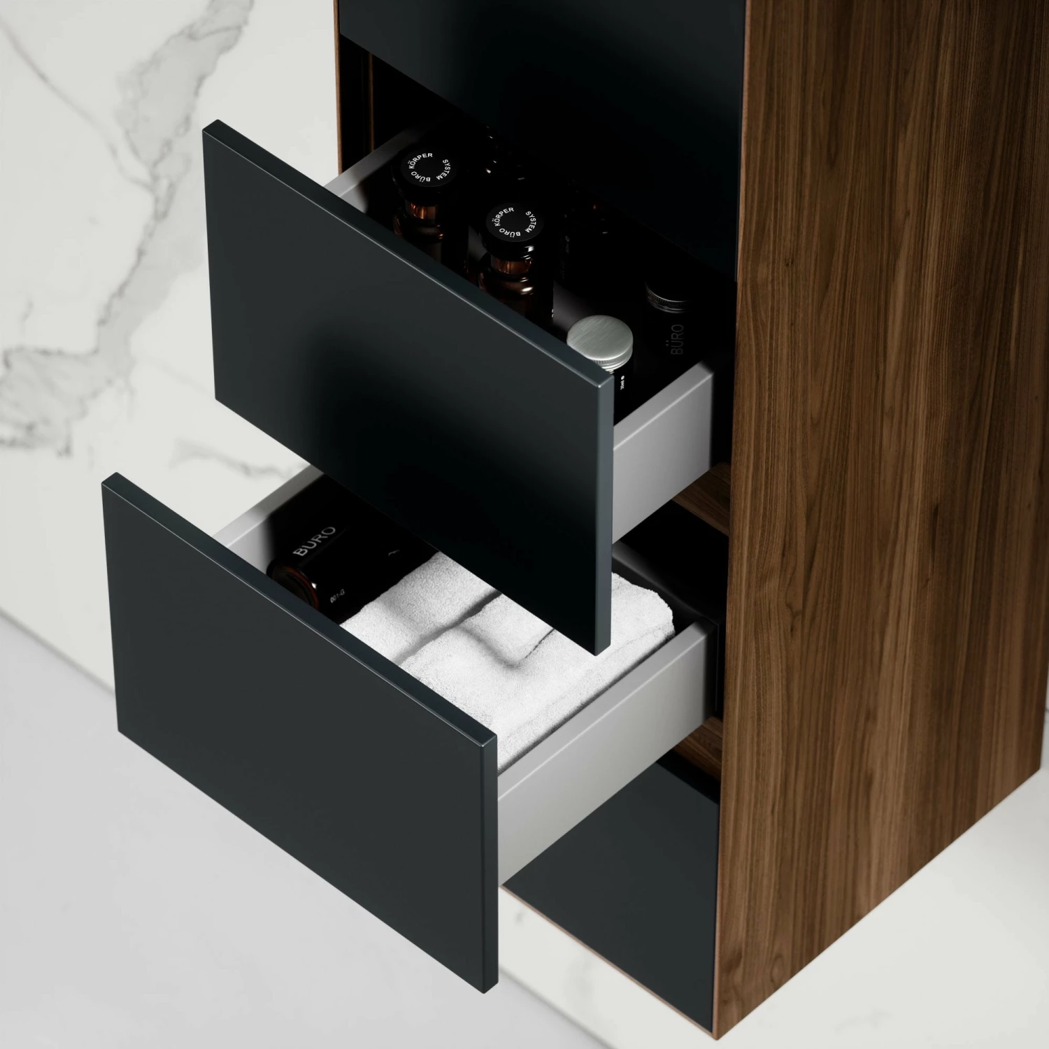 Elevate your bathroom storage with the beautifully crafted Lusso Zotto Wall Hung Cabinet. The wall hung cabinet showcases a beautiful blend of American walnut and black anthracite, finished with a subtle blue undertone. Combining classic style with contemporary craftsmanship, the Zotto is the epitome of decadent glamour. With five storage drawers, this cabinet is a stunning example of minimalist elegance and works perfectly with an array of Lusso bathroom products. Add beauty and sophistication to your interiors with luxury storage designed to elevate your home.
